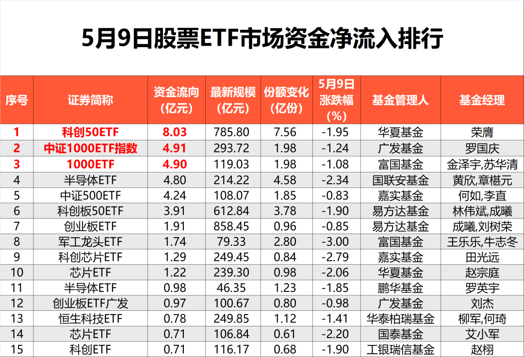 宽基ETF中,中证1000ETF指数、1000ETF吸金都超过4亿元,分别位居第二、第三名。另外,中证500ETF、科创板50ETF、创业板ETF等产品,也位居吸金榜前列。 行业或主题ETF中,半导体ETF吸金能力居首,上一交易日净流入4.8亿元,芯片ETF、恒生科技ETF等净流入资金也位居市场前列。 对于权益市场未来走势,国泰基金认为,今年一季度A股上市企业业绩边际改善,关税预期略显和缓,叠加当前政策积极表态,市场有望延续反弹趋势。 市场震荡背景下,头部基金公司旗下ETF资金净流入步伐持续。 5月9日,易方达基金旗下ETF方面,科创板50ETF净流入超3.9亿元,黄金ETF净流入3.4亿元,同标的规模第一的创业板ETF净流入超1.9亿元。 华夏基金旗下ETF方面,上一交易日,科创50ETF和芯片ETF单日净流入居前,分别净流入8.03亿元和1.22亿元,最新规模分别达785.8亿元和239.3亿元,对应跟踪指数近一月日均成交额分别为27.26亿元和5.58亿元。 宽基ETF净流出居前,单日净流出超23亿元 资金流出方面,上周五宽基ETF净流出居前,单日净流出金额达23.03亿元;规模变化方面,宽基ETF规模减少134.75亿元。 其中,沪深300指数单日净流出居前,达22.58亿元。跟踪该指数的旗舰产品——沪深300ETF,当日净流出超12亿元。易方达、嘉实旗下沪深300ETF,净流出资金也超过2亿元。