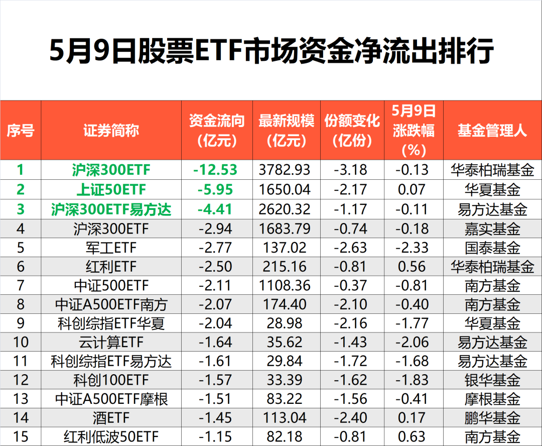5月9日,A股全天震荡调整,银行股逆市走强,ST板块反复活跃,零售股震荡走低,前期大涨的军工概念股迎来调整。 在当日股市震荡回调背景下,资金借道股票ETF净流出37亿元。其中,沪深300指数、军工板块等ETF净流出居前;净流入方面,跟踪科创50指数、创业板指、半导体等方向的股票ETF净流入靠前。 上周五净流出资金超37亿元 Wind数据显示,截至5月9日,全市场1082只股票ETF(含跨境ETF)总规模达3.53万亿元。在上周五股市震荡回调行情中,股票ETF市场总份额减少26.95亿份,按照区间成交均价测算,净流出资金为37.44亿元。 从大类型来看,上一交易日商品ETF与全球市场ETF净流入居前,分别达9.44亿元、1.1亿元。 具体到指数维度,5月9日,科创50指数单日净流入居前,达13.57亿元。跟踪该指数的旗舰产品——华夏基金旗下科创50ETF,单日净流入超8亿元。 从5日角度观测,近期资金流入科创50指数超21亿元。