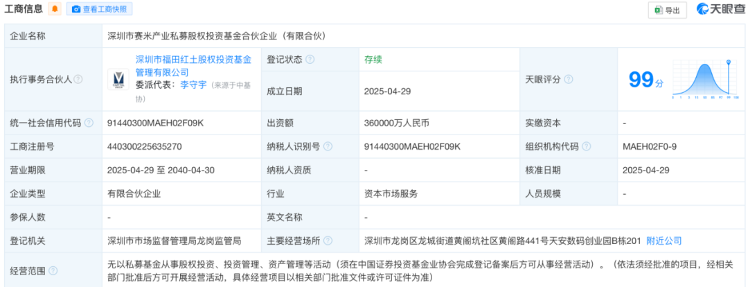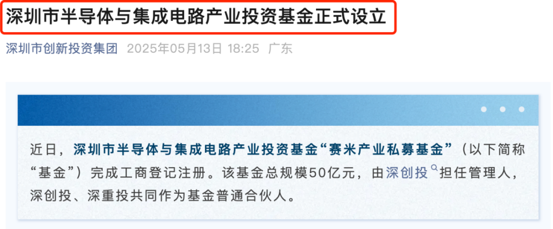 据介绍,赛米基金主要投资市半导体与集成电路重点项目和细分龙头企业及其他对完善市半导体产业链有重大作用的项目,重点围绕深圳集成电路重大制造项目集群建链、补链、强链、延链,着力构建“自主可控、高效协作、紧密配套”的本地化产业链供应链。 深创投表示,将充分发挥专业化、市场化、平台化优势,克服半导体投资难度高、额度大、周期长等难点,为优秀企业提供长期资金支持,并导入庞大已投企业生态资源、提供丰富实践应用场景,为深圳加快建设国际一流、全国领先的半导体与集成电路产业集群和生态群落,实现半导体与集成电路产业高质量跨越式发展贡献力量。 天眼查信息显示,深圳市赛米产业私募股权投资基金合伙企业(有限合伙)成立于2025年4月29日,出资额为36亿元,执行事务合伙人为深圳市福田红土股权投资基金管理有限公司,经营范围是以私募基金从事股权投资、投资管理、资产管理等活动(须在中国证券投资基金业协会完成登记备案后方可从事经营活动)。
