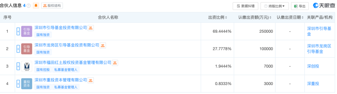 从合伙人信息来看,深圳市引导基金投资有限公司为该基金的第一大出资人,认缴出资额为25亿元,占比为69.44%;深圳市龙岗区引导基金投资有限公司是第二大出资人,认缴出资额为10亿元,占比为27.78%;还有深创投旗下的红土股权投资基金、深重投分别出资7000万元、3000万元,出资比例分别为1.94%、0.83%。