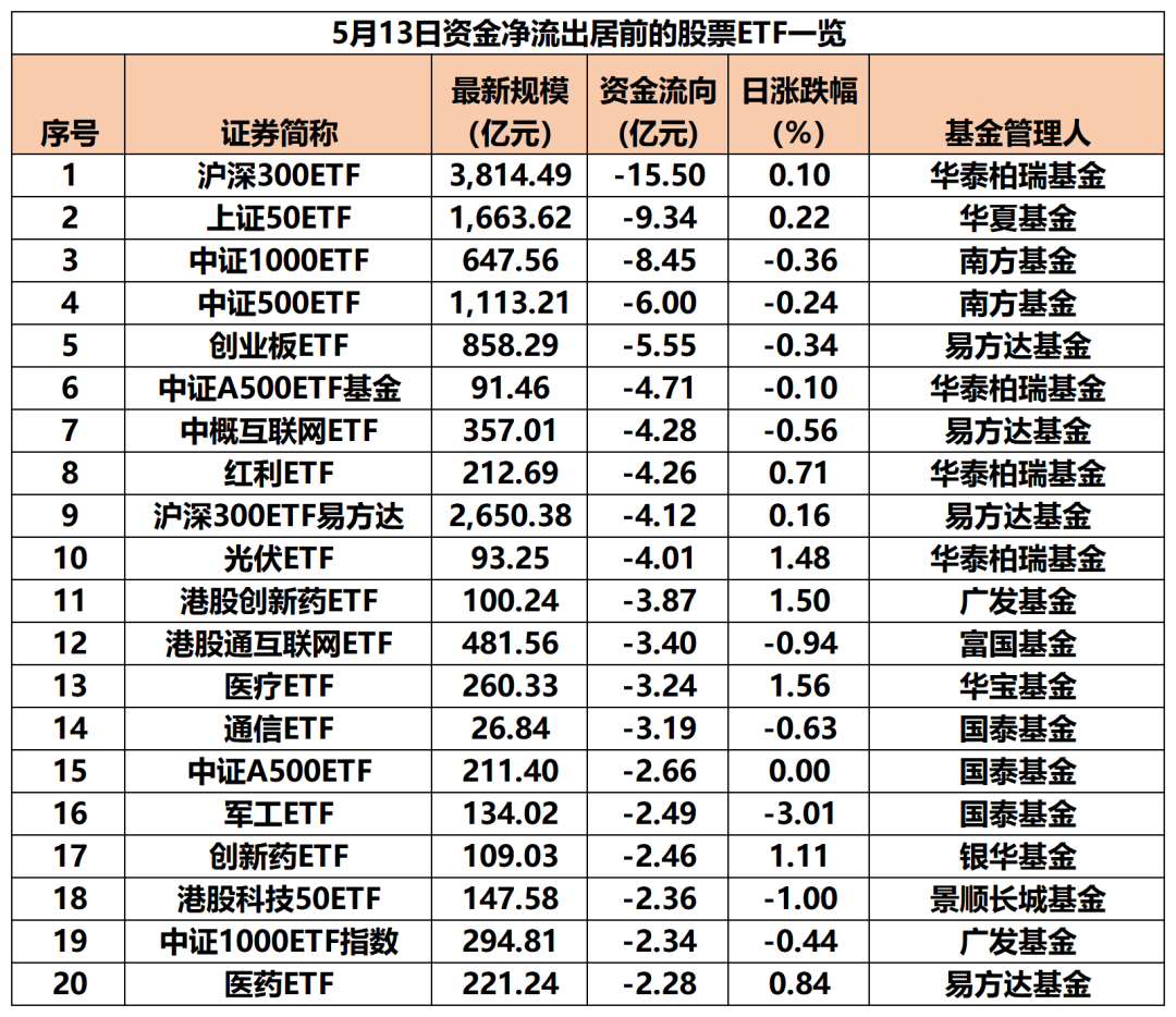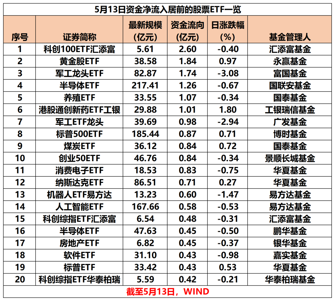 昨日,A股高开低走,沪指勉强收红,军工股全线调整。股票ETF(含跨境ETF)整体资金净流出超160亿元,沪深300指数、上证50指数、中证1000指数、中证500指数相关宽基ETF成为“失血”大户,黄金股ETF、军工龙头ETF、半导体ETF、养殖ETF、煤炭ETF等多只热门主题ETF“霸榜”资金净流入排行榜。 股票ETF单日资金净流出超160亿元 5月13日,A股市场全天高开低走,主要指数涨跌不一。截至收盘,沪指涨0.17%,深成指跌0.13%,创业板指跌0.12%,北证50指数跌0.94%。盘面上,光伏、银行板块全天震荡上扬,多只银行股创出历史新高。 5月13日,股票ETF(含跨境ETF)整体资金净流出161.67亿元,最新规模为3.55万亿元。 从大类型来看,商品ETF与全球市场ETF净流入居前,分别为0.8亿元和3.93亿元;宽基ETF净流出居前,达65.62亿元;规模变化方面,港股市场ETF减少100.67亿元。 具体到指数维度,5月13日,沪深300指数单日净流出居前,达21.43亿元。从5日角度观测,近期,资金流入科创50指数超40亿元,SGE黄金9999超31亿元。 头部基金公司方面,易方达基金ETF最新规模为6459.2亿元,2025年以来增加452.7亿元(净流入315.2亿元)。 机器人ETF易方达净流入0.6亿元,人工智能ETF净流入0.6亿元,纳指ETF易方达净流入0.1亿元,科创人工智能ETF净流入0.1亿元,消费电子ETF易方达净流入0.05亿元。 华夏基金ETF方面,上一交易日,信用债ETF基金和纳斯达克ETF单日净流入居前,分别净流入1.3亿元和0.71亿元,最新规模分别达41.46亿元和86.51亿元,对应跟踪指数近一月日均成交额分别为19.73亿元和7.04亿元。 沪深300、上证50、中证1000、中证500等指数相关宽基ETF成为“失血”大户 从单日资金净流入排行看,科创100ETF汇添富“吸金”2.6亿元,位居首位。此外,黄金股ETF、军工龙头ETF、半导体ETF、养殖ETF、煤炭ETF等多只热门主题ETF“霸榜”资金净流入排行榜。