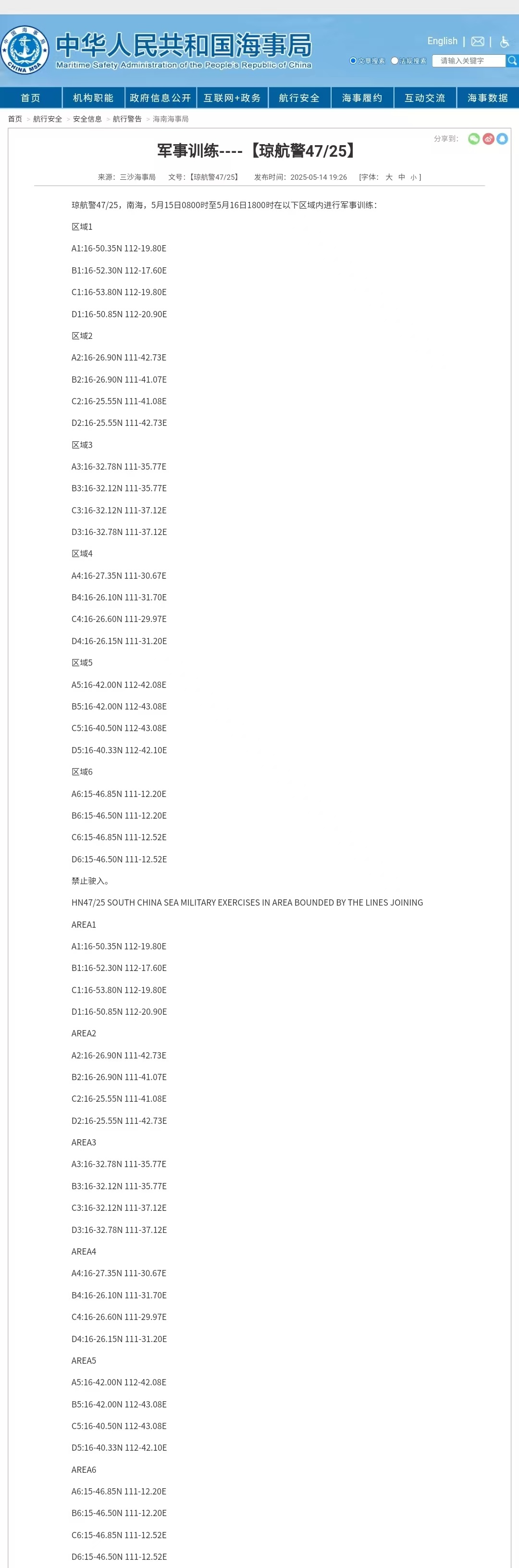 据中国海事局网站消息,三沙海事局发布航行警告,5月15日8时至5月16日18时,南海部分海域进行军事训练,禁止驶入。