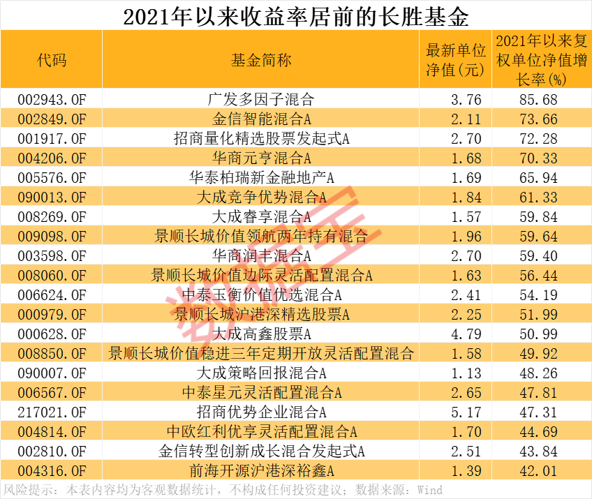 长期跑赢大盘的主动权益类基金有哪些? 公募基金从重规模向重回报转变 公募基金行业近日迎来重大改革。5月7日,中国证监会公布《推动公募基金高质量发展行动方案》(以下简称《方案》),提出一系列回应市场和社会关切的改革措施,着力督促基金公司、基金销售机构等行业机构从“重规模”向“重回报”转变。 华夏基金总经理李一梅认为,《方案》坚持以投资者为本,要求行业机构牢固树立以投资者最佳利益为核心的经营理念,并贯穿于公司治理、产品发行、投资运作、考核机制等基金运营管理全链条、各环节,实现从重规模向重投资者回报转型。通过机制调整,实现公募基金功能性和盈利性的有机统一,强化与投资者利益绑定,有助于行业回归业绩本源和高质量发展。 信达证券表示,从整体来看,表现不及基准的基金占多数。近三年数据显示,约30%的主动权益基金相对于自身基准的超额收益低于-20%,超过75%的基金未能战胜基准,只有约四分之一实现超额收益为正。伴随《方案》的落地,从中短期来看,公募基金存量产品可能发生行业/个股层面的持仓转移,以控制基金相对于基准的偏离;从长期来看,公募基金在布局产品时需考虑到业绩基准的重要性,并且会批量更改存量产品的业绩基准。 长胜基金数量稀少,82只产品脱颖而出 证券时报·数据宝以成立日期在2021年以前的主动权益类基金为基础,按照以下条件统计出长期回报率较高的基金:1.2021年至2024年期间,每年收益率均跑赢同期沪深300指数;2.截至2025年5月16日,2025年以来收益率也跑赢同期沪深300指数;3.有A/C类基金的,仅统计A类。统计发现,共计82只基金入围。 从长期收益率来看,上述82只基金2021年以来复权单位净值增长率均值为25.93%。13只基金2021年以来复权单位净值增长率在50%以上。 区间收益率最高的是广发多因子混合,2021年以来复权单位净值增长率达到85.68%。该基金属于灵活配置型,截至2025年一季度末,股票配置比例达到83.09%。今年一季度末,广发多因子混合头号重仓股为华泰证券,期末持仓市值为8.86亿元;其次是泽璟制药-U、科伦药业、宁德时代、龙净环保、国泰海通等。 金信智能混合A收益率排在第二位,2021年以来复权单位净值增长率为73.66%。该基金同样属于灵活配置型,截至2025年一季度末,股票配置比例达到85.04%。今年一季度末,该基金偏好银行板块,前十大重仓股有9只属于银行股。金信智能混合A第一大重仓股为交通银行,期末持仓市值达到0.39亿元;其次是中国银行、建设银行、农业银行、平安银行、中国平安等。 招商量化精选股票发起式A收益率排在第三位,2021年以来复权单位净值增长率为72.28%。该基金属于普通股票型,截至2025年一季度末,股票配置比例达到92.71%。从今年一季度基金持仓情况来看,这只基金行业配置比较均衡,头号重仓股运达股份属于风电行业,持仓市值达到0.8亿元;第二大重仓股杰克股份属于机械设备行业,持仓市值靠前的还有通信股亨通光电、钢铁股甬金股份、化工股湖南海利以及医药股浙江医药。