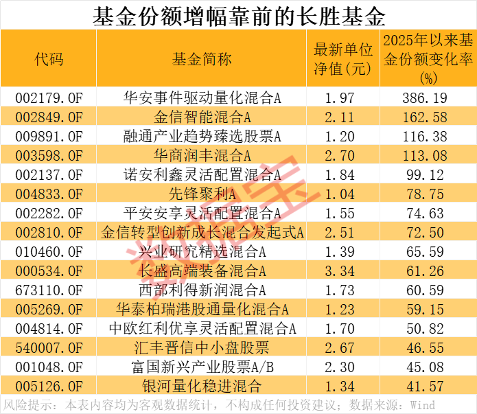 由于A股市场行情阶段性变化,不少基金的收益率波动大,能够长期保持正收益的基金数量稀缺。据数据宝统计,上述82只长期跑赢大盘的基金中,截至5月16日收盘,2021年以来各年度收益率均为正值的仅9只,包括金信智能混合A、华商元亨混合A、大成睿享混合A、景顺长城价值领航两年持有混合、华商润丰混合A等。 25只长胜基金今年以来份额增长明显 2025年以来,上述82只长期跑赢大盘的基金中,部分基金获得投资者青睐,基金份额增长显著。据数据宝统计,截至5月16日收盘,有25只基金今年以来基金份额增幅在20%以上(A/C类基金份额合并统计),其中有4只基金份额翻番。 基金份额增长最高的是华安事件驱动量化混合A,增幅达到386.19%。该基金今年一季度末股票配置比例为84.63%,持有较多的大蓝筹股,持仓市值较高的有安井食品、招商银行、贵州茅台、中国神华、伊利股份、上海银行等。 金信智能混合A、融通产业趋势臻选股票A、华商润丰混合A3只基金年内总份额也翻番。