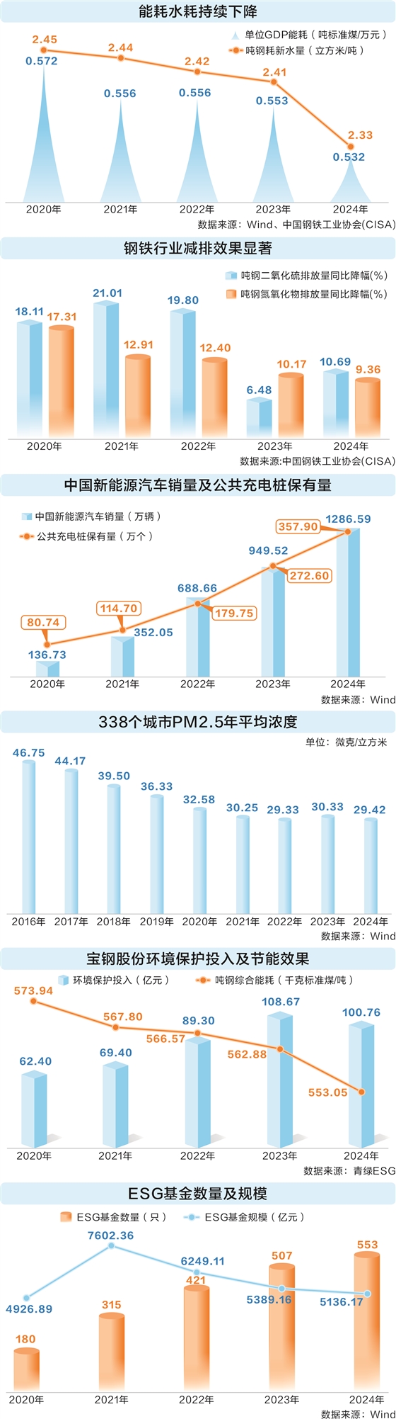 证券时报记者 匡继雄 “十四五”期间,我国以能源结构优化为基础,重点行业转型为核心,环境治理强化为支撑,金融体系创新为纽带,构建起绿色低碳发展的系统性框架,取得了全方位、开创性成就,为高质量发展注入强大绿色动力,也为全球可持续发展贡献了中国智慧与力量。 本文为《数说“十四五”》第三篇,从源头减排到实际效果验证,再到长期资金保障,全面展现我国绿色低碳发展全景。 双轮驱动能耗持续下降 “十四五”以来,我国通过产业转型与能源革命双轮驱动,推动重点领域节能减排取得显著成效。截至2024年,全国单位GDP能耗较“十三五”末下降6.96%,单位GDP二氧化碳排放量显著降低。 高耗能行业绿色转型步伐坚定。钢铁行业通过技术升级与管理优化,水资源利用效率与污染物减排成效显著。2024年吨钢新水消耗较2020年下降4.9%,吨钢二氧化硫、氮氧化物排放分别较2020年下降47.09%和37.88%。 以行业龙头宝钢股份为例,据青绿ESG数据,公司2024年环境保护投入达100.76亿元,较2020年增长61.47%;吨钢耗新水量较2020年下降13.79%;氮氧化物和硫氧化物排放较2020年下降幅度均超四成。 能源结构持续优化,截至2024年底,我国可再生能源装机规模达到18.89亿千瓦,约占我国总装机的56%,较“十三五”末实现翻倍,占据我国电力装机的“半壁江山”,成为能源供应的核心支柱。绿色制造体系加速构建,国家级绿色工厂数量从2021年的2783家增至2024年的6430家,生产过程中广泛应用绿色技术,引领工业低碳发展。 科技创新为工业减排注入核心动力。科技部等九部门联合印发的《科技支撑碳达峰碳中和实施方案(2022—2030年)》明确了低碳核心技术突破目标。 截至2024年末,在可比口径下,同花顺环保行业A股上市公司专利数量达2.3万件,较“十三五”末增长超过70%,绿色低碳技术研发和产业化应用步伐显著加快。 新能源汽车领跑全球 新能源汽车产业的爆发式增长成为“十四五”期间绿色交通转型的核心亮点。2024年,我国新能源汽车销量达1286.59万辆,占汽车总销量的比例攀升至40.93%,较2020年提升35.53个百分点,年复合增速高达75.14%。2025年前4个月,新能源汽车销量持续强劲,达430万辆,同比增长46.24%,市场占有率进一步提升至42.75%。 龙头企业比亚迪表现亮眼,不仅在中国市场占据领先地位,而且在全球新能源汽车市场中扮演着重要角色。比亚迪2025年前4个月销售新能源汽车138.09万辆,同比增长46.98%。2021年至2024年,公司销量年复合增速高达117.85%,2024年新能源汽车销量达427.21万辆,拿下中国汽车市场车企销量、中国汽车市场品牌销量、全球新能源车市场销量的三大冠军。公司ESG评级也得到国际机构的认可,2020年以来MSCI ESG评级持续在A级以上。 新能源汽车产业的发展不仅减少了交通领域的碳排放,还带动了产业链竞争力的全面提升。在电池方面,2024年中国锂离子电池产量同比增长20.1%,达到294.57亿只,2021年—2024年复合增长率达11.81%,显示出强劲的增长势头,全球市占率达到八成左右。充电基础设施快速普及,截至2024年底,全国公共充电桩保有量达357.9万个,较2020年增长3.43倍,构建起覆盖城乡的充电网络,为新能源汽车普及提供坚实支撑。 蓝天碧水净土保卫战全面告捷 环境治理成效在“十四五”期间全面显现。2024年,全国338个城市PM2.5年平均浓度降至29.42微克/立方米,较2020年末下降9.72%。北京市作为大气污染治理典范,PM2.5浓度较2020年下降19.74%,空气质量保持持续改善趋势。大气污染防治重点区域亦改善明显,全国74个城市2024年12月平均优良天数比例达82.7%,较2020年12月提升17.9个百分点。 水环境质量持续向好,地表水水质优良(Ⅰ-Ⅲ类)比例由2020年12月的84.6%提升至2024年12月的93%,重点流域生态修复成效显著。长江经济带作为绿色发展先行区,2024年12月地表水质优良比例达98%,高于全国平均水平5个百分点,较2020年12月提升2.6个百分点,实现了“在发展中保护、在保护中发展”的良性循环。 全国土壤环境风险得到基本管控。2024年,土壤重点风险监控点重金属含量整体呈下降趋势,全国受污染耕地安全利用率达到92%,重点建设用地安全利用得到有效保障,优先监管地块实施污染管控率达到75%以上。 资金活水润泽低碳发展 绿色转型离不开绿色金融支持。近年来,国家出台《关于进一步强化金融支持绿色低碳发展的指导意见》等多份重要文件,推动绿色金融发展。 目前,我国绿色金融态势良好,绿色信贷、债券、绿色基金等产品不断丰富,支持清洁能源、节能环保等领域,助力经济绿色转型。 其中,绿色信贷为主力融资渠道,金融机构绿色贷款余额从2020年末的11.95万亿元攀升至2024年末的36.6万亿元,超六成投向碳减排效益项目。绿色债券市场实现跨越式发展,2021—2024年境内市场年平均发行规模达1.11万亿元,是“十三五”时期的3.94倍,涵盖碳中和债、蓝色债券等创新品种,发行主体从金融机构向实体企业扩展。 此外,绿色基金对绿色经济的推动作用显著。ESG基金作为代表,专注于投资那些环境友好、社会责任强、治理良好的企业,正逐渐成为推动绿色经济发展的重要力量。 截至2024年末,国内ESG基金总数攀升至553只,规模达5136.17亿元,分别较2020年末增长207.22%和4.25%。 资本市场对环保企业支持力度也在加大。2021年至2024年,生态保护和环境治理行业的上市企业年平均融资额(含首发、增发、配股、可转债)达56.84亿