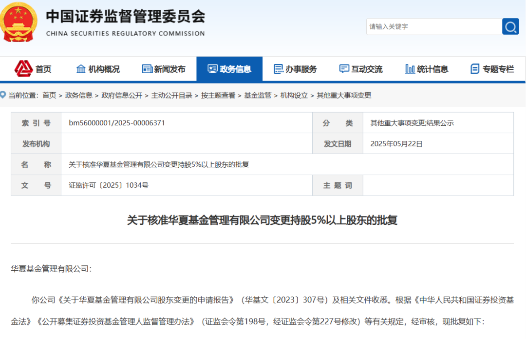 公募基金巨头华夏基金股权变更迎来最新进展。 5月22日晚间,中国证监会网站显示,核准卡塔尔控股有限责任公司成为华夏基金管理有限公司(以下简称华夏基金)持股5%以上股东,对卡塔尔控股有限责任公司依法受让华夏基金2380万元人民币出资(占注册资本比例10%)无异议。 业内人士表示,此次股权变更获批复,意味着华夏基金迎来中东资本入局,卡塔尔投资局成为华夏基金第三大股东。这一交易凸显了外资加仓布局中国的信心。 中国证监会表示,华夏基金及各股东应当按规定及时办理工商变更登记等相关事宜,完善公司治理结构,维护公司及基金份额持有人的合法权益。