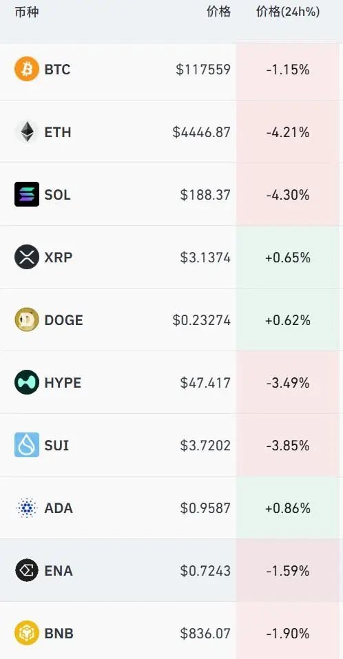 近两日比特币出现跳水,回落至11.76万美元下方。本周一度涨超12万美元。 今日加密货币普遍下跌,截至发稿,比特币跌逾1%,以太坊则跌超4%。