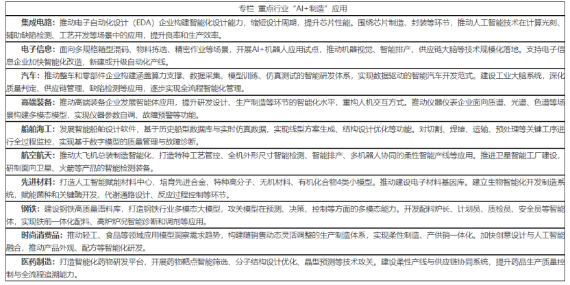 事关AI。 上海市经济和信息化委员会等部门8月19日发布 《上海市加快推动“AI+制造”发展的实施方案》(以下简称《实施方案》)。《实施方案》提到,实施“模塑申城·AI+制造”行动,推动人工智能技术与制造业深度融合,加快赋能新型工业化,形成新质生产力。 《实施方案》明确,通过三年时间努力,力争上海市制造业智能化发展水平进一步提升,在语料、模型、平台、场景等领域形成一批创新成果。推动3000家制造业企业实现智能化应用;打造10个行业标杆模型,形成100个标杆智能产品;推广100个示范应用场景,建设10个左右“AI+制造”示范工厂;发展5家左右综合集成服务商,培育一批具有竞争力的专业服务商,加快形成制造业智能化发展生态。 围绕产融对接,《实施方案》提出,探索将接入工业互联网等平台的企业生产数据作为银行贷款增信项。支持服务商等企业通过所持有的知识产权、专利技术进行质押融资。发挥市政策性融资担保基金作用,对符合条件的企业提供融资担保服务。推动市区相关产业基金、社会资本等支持“AI+制造”发展,精准投向语料建设、模型开发、场景应用、服务商等项目和创新主体。 打造细分领域行业模型 7月30日召开的上海市政府常务会议指出,必须把握人工智能赋能制造业的战略机遇,以AI驱动制造业高端化、智能化、绿色化、融合化升级,助力“上海制造”向“上海智造”跃升。要推动创新赋能,把握轻量化技术新趋势,着力开发面向垂类领域的工业级智能体,实现“小切口”精准赋能。要分类施策,制定差异化“AI+”实施路径,“一业一策”分类推进,传统制造业要推动生产流程智能化改造,新兴制造业重点布局智能终端等原生赛道。 在基础和前沿技术上,《实施方案》要求,推动基础模型开展多模态算法创新,加强对流体、电磁、真空等物理规律的理解,提升物理仿真能力;加强对工业图纸、操作手册、产品缺陷等信息的识别,提升视觉处理能力;加强对时序数据、工艺约束规则的理解,提升智能决策能力。 针对重点行业,《实施方案》要求,聚焦集成电路、电子信息、汽车、高端装备、船舶海工、航空航天、先进材料、钢铁、时尚消费品、医药制造等行业,推动企业创新应用人工智能技术,打造细分领域行业模型,发展面向特定场景的专用小模型,构建多层次工业模型体系,提升大模型和小模型的协同效率,加快在工业场景中落地应用。 ![]() 让人形机器人加快进厂 《实施方案》还要求,建设“AI+制造”工厂。推动建设以智能体高密度分布、多场景集成为特征的“AI+制造”示范工厂,综合应用空间计算、多智能体协同等技术,集聚各类场景模型、智能产品和装备,推进以人形机器人为代表的多类型具身智能在典型场景中的实用化部署。 同时,支持电子信息、汽车、装备等重点行业面向重复性强、危险性高、对健康存在危害的工作场景部署应用工业机器人,提高生产效率和生产安全性。推动智能机器人在装配、焊接、喷涂、物料搬运等环节开展规模化应用。推动钢铁、船舶等行业打造人机协同智能制造作业单元,实现复杂工序无人化。制定工业场景人形机器人安全性可靠性检验检测方法,推动产品“持证上岗”。 在AI+消费终端上,《实施方案》明确,推动消费终端企业与人工智能企业合作开发端侧模型,开展云端模型端侧部署,提升终端的模型应用能力,推动终端智能化操作创新。推动AI计算机、AI眼镜和AI手机等新型智能消费终端迭代升级,加快引导产业链上下游企业集聚,促进智能终端产业集群发展。