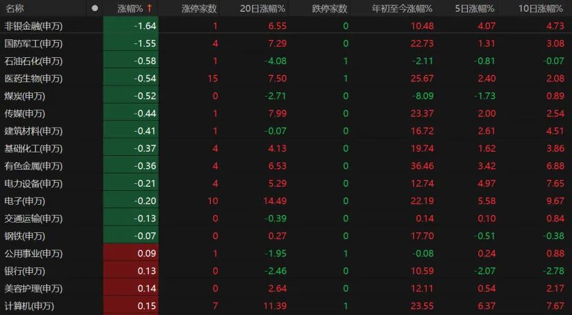 非银金融、国防军工板块跌幅均超过1%,中油资本、中科海讯、泰豪科技、四创电子涨停。生物医药板块微跌,但仍有ST香雪、透景生命、福瑞股份、博济医药等15只相关个股涨停。