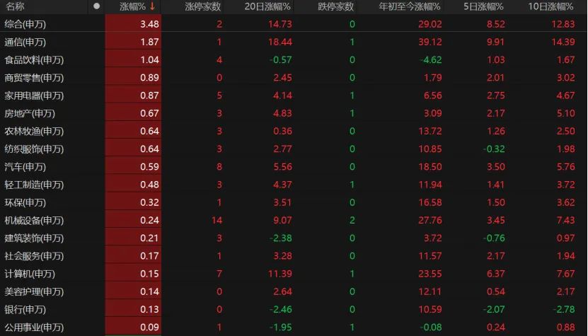 受访人士表示,A股此次窄幅震荡主要属于技术性调整范畴。从资金流向来看,呈现出高低切换特征,部分资金开始从高位板块撤离,转而布局消费等相对滞涨的板块。短期来看,市场整体仍维持震荡上行的态势。 2984只个股收涨 今日,沪指收跌0.02%报3727.29点,创业板指收跌0.17%报2601.74点,深证成指收跌0.12%。科创50、上证50跌约1%,沪深300微跌,北证50收涨1.27%。 市场交投氛围相对活跃,日成交额由昨日的2.81万亿元降至2.64万亿元。个股方面,涨跌互现,其中2984只个股收涨,涨停股104只;2255只个股收跌,跌停股10只。截至8月18日,两融余额增至2.1万亿元。 31个申万一级行业板块中,有18个飘红。综合板块继续走高,今日以3.48%的涨幅领先全场,悦达投资、南京新百涨停,该板块年内涨幅约为29%;通信板块今日涨近2%,剑桥科技涨停;食品饮料、商贸零售、家用电器板块表现突出,李子园、酒鬼酒、桂发祥涨停,同洲电子、春光科技、富佳股份、海立股份、四川长虹涨停;房地产、农林牧渔、纺织服饰板块也收涨,申联生物20cm涨停,梦洁股份、红豆股份涨停。天润工业、全柴动力、腾龙股份、动力新科、南方精工、拓普集团、明新旭腾、天汽模8只汽车股涨停。