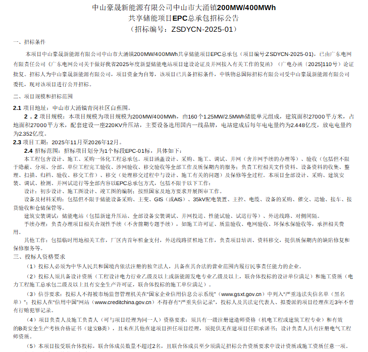 北极星储能网讯:9月2日,中山豪晟新能源有限公司发布广东中山市大涌镇200MW/400MWh共享储能EPC招标公告,项目位于广东中山大涌镇,项目资金自筹。 本项目规模200MW/400MWh,由160个1.25MW/12.5MWh储能单元组成,建筑面积27000平方米,占地面积27000平方米,配套建设一座220KV升乐站,主要设备选用国内一线品牌,电站建成后每年电电量约为2.448亿度,放电电量约为2.352亿度。 项目工期为2025年11月-2026年12月。本工程包含设计、施工、采购一体化工程总承包。项目涵盖设计、采购、施工、调试、并网(含并网手续的办理等)、验收。 本项目接受联合体投标。 原文如下: