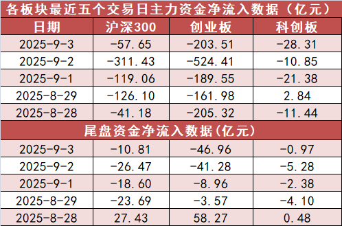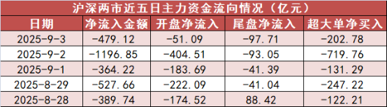 9月3日,A股市场整体下跌。 截至收盘,上证指数收报3813.56点,下跌1.16%,深证成指收报12472点,下跌0.65%,创业板指收报2899.37点,上涨0.95%,北证50指数下跌1.49%。A股市场合计成交23961.02亿元,较上一交易日减少5166.64亿元。 1. A股市场全天主力资金净流出479.12亿元 今日A股市场主力资金开盘净流出51.09亿元,尾盘净流出97.71亿元,全天净流出479.12亿元。