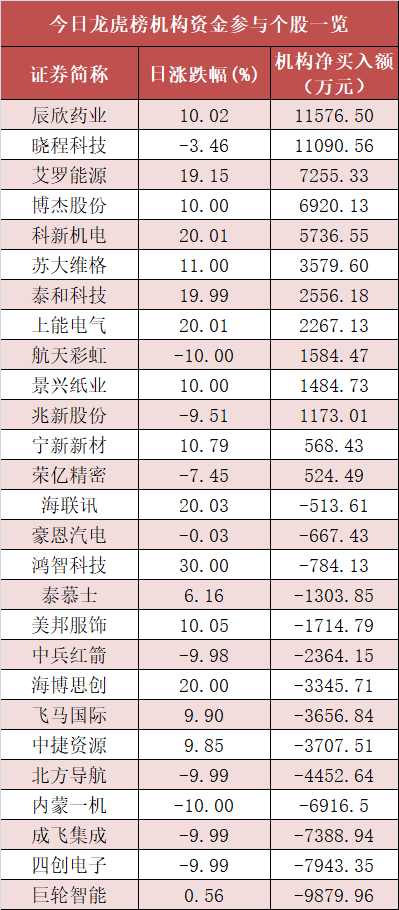 (注:此表为主力资金净流入统计,与上一张表及下一张表的机构净买入统计口径均不同) 5. 龙虎榜机构抢筹多股 盘后龙虎榜数据显示,机构现身多股,其中辰欣药业等股票呈现机构资金净买入,巨轮智能等股票呈现机构资金净卖出。