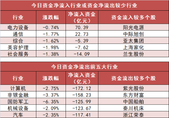 3. 电力设备行业净流入70.39亿元居首 申万一级行业中,2个行业实现资金净流入,其中电力设备行业净流入70.39亿元居首。