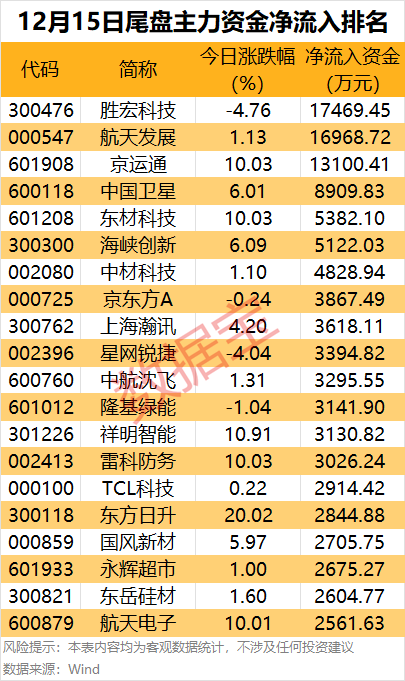 国防军工行业主力资金净流入15.73亿元,远超其他行业。 A股三大指数今日(12月15日)集体回调。行业板块涨跌互现,保险、商业百货、食品饮料、化纤行业、贵金属板块涨幅居前,船舶制造、能源金属、半导体、生物制品、消费电子板块跌幅居前。 据证券时报·数据宝统计,今日沪深两市主力资金净流出360.27亿元。从行业来看,申万一级行业中有9个行业主力资金净流入,其中国防军工行业主力资金净流入15.73亿元,远超其他行业;商贸零售、食品饮料、房地产、纺织服饰行业主力资金净流入金额分别为7.63亿元、5.92亿元、1.64亿元、1.47亿元。 22个主力资金净流出的行业中,电子行业主力资金净流出金额居首,为102.58亿元;有色金属、电力设备行业主力资金净流出金额均超40亿元;通信、机械设备、计算机、传媒行业主力资金净流出金额均超20亿元。 商业航天概念股获主力资金抢筹 从个股来看,60股主力资金净流入超1亿元,其中11股净流入金额在3亿元及以上。 商业航天概念股雷科防务、三维通信、通宇通讯主力资金分别净流入14.12亿元、7.08亿元、5.9亿元,排名前三位。今日A股市场商业航天股再度集体爆发,其中,雷科防务专业从事雷达系统、卫星应用、智能控制、安全存储、智能网联等业务;龙虎榜数据显示,上榜营业部席位全天成交14.34亿元,合计净买入7.65亿元;具体来看,深股通专用席位、机构席位分别净买入1.99亿元、1.51亿元。 海南自贸概念股海马汽车主力资金净流入5.31亿元,消息面上,海南“十五五”规划建议提出,加快完善自由贸易港政策制度体系。提升优化以“零关税、低税率、简税制”“五自由便利一安全有序流动”为主要特征的政策制度体系。