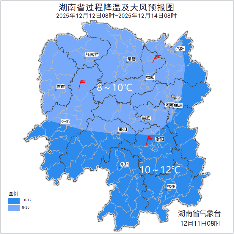 湖南省过程降温及大风预报图(12日08时至14日08时)