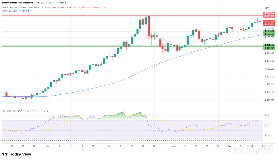 尽管美元回调且美国国债收益率下滑,但金价仍徘徊在4300美元附近。 从技术面来看,黄金需要收于4300美元上方才能获得额外动能,并向阻力位4370-4380美元移动。 白银