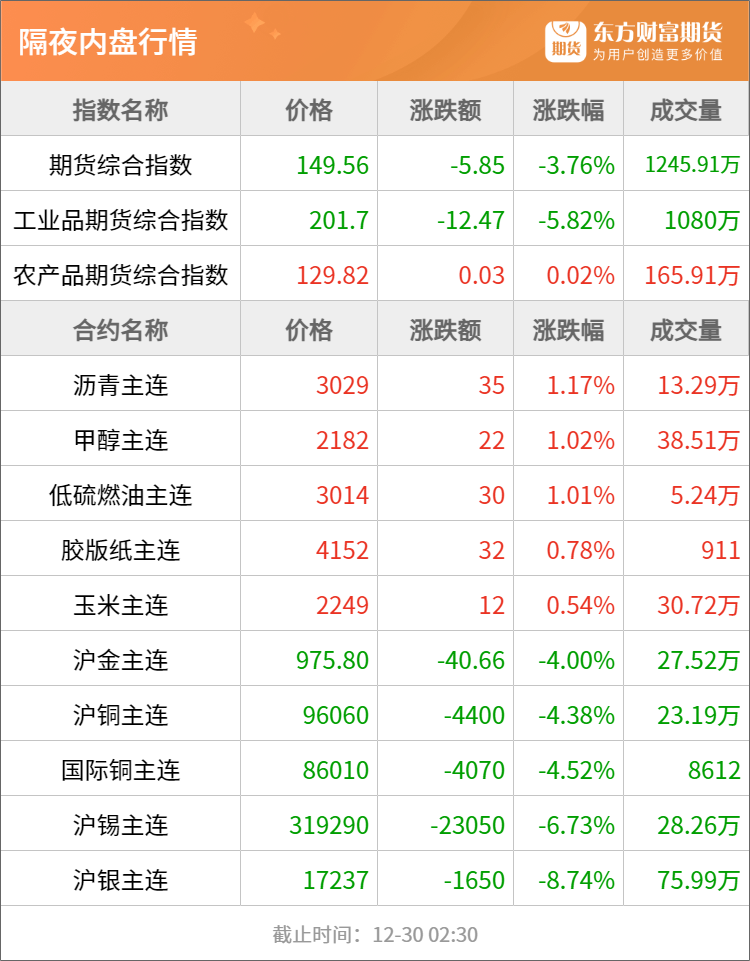 隔夜行情![]() ![]() 每日精选CME出手!白银狂飙后跳水市场担忧高杠杆风险被引爆 利空突袭!凌晨史诗级暴跌!贵金属市场遭遇“黑色星期一” 2026年1月1日起我国调整部分商品关税税率税目 宏观产经央视新闻:市场监管总局部署2026年重点任务,包括:持续深化公平竞争治理,加力破除行政性垄断,加强反垄断反不正当竞争执法,深入整治“内卷式”竞争;推动提高经营主体发展质量,完善市场准入退出制度,提升经营主体信用水平,强化知识产权和商业秘密保护。强化平台经济常态化监管,压实平台企业“守门人”责任,突出抓好平台规则治理,加快平台监管“一库一码一系统”建设。 财政部网站:1-11月国有企业营业总收入756257.6亿元,同比增长1.0%;1-11月国有企业利润总额37194.5亿元,同比下降3.1%;1-11月国有企业应交税费52803.0亿元,同比增长0.2%。 央视新闻:12月29日,中柬泰外长会晤在云南玉溪成功举行。三方会晤后发表新闻公报,从五个方面明确柬泰将进一步加强沟通,增进理解,循序渐进地巩固停火局面、恢复彼此交往、重建政治互信、实现关系转圜、维护地区和平。 品种资讯黑色系期货 焦炭:12月29日,河北部分钢厂对湿熄焦炭下调50元/吨、干熄焦炭下调55元/吨,2026年1月1日零点执行,焦炭第四轮提降开启。(我的钢铁网) 螺纹钢:天钢计划于1月1日起对一座2000m³高炉进行检修,日均影响产量0.6万吨,检修时长为30天。(SMM) 铁矿石:2025年12月22日-12月28日中国47港铁矿石到港总量2727.8万吨,环比减少62.4万吨;中国45港铁矿石到港总量2601.4万吨,环比减少45.3万吨;北方六港铁矿石到港总量1330.6万吨,环比增加74.2万吨。(Mysteel) 2025年12月22日-12月28日全球铁矿石发运总量3677.1万吨,环比增加212.6万吨。澳洲巴西铁矿发运总量3059.6万吨,环比增加244.8万吨。澳洲发运量2113.7万吨,环比增加163.1万吨,其中澳洲发往中国的量1867.6万吨,环比增加173.0万吨。巴西发运量945.9万吨,环比增加81.8万吨。(Mysteel) 农产品期货 豆油:截至2025年12月26日,全国重点地区豆油商业库存108.9万吨,环比上周减少3.45万吨,降幅3.07%。(我的钢铁网) 棕榈油:截至2025年12月26日(第52周),全国重点地区棕榈油商业库存73.41万吨,环比上周增加3.41万吨,增幅4.87%;同比去年52.84万吨增加20.57万吨,增幅38.93%。(我的钢铁网) 大豆:12月以来,国内油厂大豆压榨量保持在200万吨以上高位。根据压榨情况监测,截至12月26日全国主要油厂大豆压榨量约770万吨,预计12月全月国内主要油厂大豆压榨量在890万吨左右,同比增加约70万吨,较过去三年同期均值增加约60万吨。(国家粮油信息中心) 有色/贵金属期货 黄金:12月29日,据报道,瑞银将其2026年前三季度的黄金目标价上调至每盎司5000美元,此前目标价为每盎司4500美元。瑞银同时预计到2026年底,金价将小幅回落至每盎司4800美元。(界面新闻) 碳酸锂:龙蟠科技(603906.SH)公告称,公司控股子公司常州锂源磷酸铁锂产线已超负荷运转,为确保生产线安全稳定高效运行,自2026年1月1日起,将对部分产线进行减产检修,预计检修时间一个月,预计减少磷酸铁锂产量5,000吨左右,预计不会对公司2026年经营业绩产生重大影响。(财联社) 赣锋锂业(002460.SZ)公告称,公司于2025年12月29日收到宜春市公安局的移送起诉告知书,因涉嫌内幕交易罪单位犯罪,案件已移送检察机关审查起诉。该事项系在江西证监局行政处罚的基础上,依法开展的后续正常司法程序。公司生产经营活动保持正常有序运行,预计不会影响公司正常的生产经营。公司将持续关注进展情况,并及时履行信息披露义务。(财联社) 沪铝:洛阳、巩义地区环保管控力度持续加码,部分当地铝加工企业已全面停产,现货需求随之持续萎缩,预计于元旦假期结束后逐步恢复生产。与此同时,SMMA00中原对铝当月合约贴水扩大至390元/吨,创历史低位。(SMM) 沪锌:华中某锌矿因年度计划完成,于12月检修停产,环比带来近2000金吨的锌精矿减量;西南某锌矿12月检修减产,计划于1月产量恢复,预计将带来2000金吨左右的锌精矿增量;随着气温逐渐下降,华北某锌矿于12月初常规冬季停产,预计于明年3月常规复产。(SMM) 能化期货 纯碱:博源化工发布公告,为降低公司运营成本,避免继续生产导致更大规模的亏损和资金投入,决定对苏尼特碱业实施长期停产。(新华财经) 纯苯:截至12月29日,江苏纯苯港口样本商业库存总量30万吨,较上期库存27.3万吨上升2.7万吨,环比增加9.89%;较去年同期库存19.22万吨累库10.78万吨,同比上升56.09%。12月22日-12月28日,不完全统计到货约3.95万吨,提货约1.25万吨。周期内,所统计库区中,3个库区上升,4个库区持稳。(隆众资讯) 其它期货 欧线集运:据上海航运交易所数据,截至2025年12月29日,上海出口集装箱结算运价指数(欧洲航线)报1742.64点,与上期相比涨9.7%。(财联社) 环球视野央视新闻:当地时间12月29日,俄罗斯总统新闻秘书佩斯科夫表示,普京和特朗普将在近期再次进行电话会谈。美国总统特朗普28日表示,他在当天与乌克兰总统泽连斯基会面之前,同俄罗斯总统普京进行了“一次良好且富有成效的通话”。 财联社:中国贸促会29日发布的数据显示,10月份全球经贸摩擦指数为104,处于高位。全球经贸摩擦措施涉及金额同比下降7.3%,环比下降1.2%。从行业指数看,在监测范围内13个主要行业中,经贸摩擦措施的冲突点聚焦于电子、医药、机械设备和轻工行业,其中电子行业经贸摩擦指数居