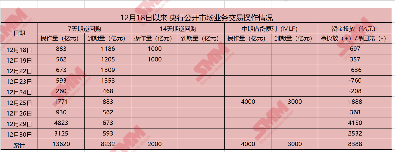 编者按:临近年末,跨年流动性调节进入关键节点,央行精准发力加大资金投放力度,为市场平稳“跨年”筑牢流动性安全垫。从具体操作来看,12月29日、30日两个关键交易日,央行分别实现净投放4150亿元、2532亿元,两日累计净投放规模逾6682亿元,力度尤为显著。为提前布局跨年流动性供给,央行已于12月18日、19日同步开启14天期逆回购操作,通过跨期工具精准匹配资金需求周期。值得关注的是,12月25日在3000亿元中期借贷便利(MLF)到期的背景下,央行顺势开展4000亿元MLF投放,单月实现MLF净投放1000亿元,延续了连续10个月的加量操作态势。据SMM汇总数据显示,自12月18日以来的9个交易日内,央行公开市场业务累计向市场净投放资金达8838亿元。整体来看,12月中下旬以来,央行持续加码公开市场资金投放力度,从短期逆回购到中期MLF工具协同发力,从常规期限到跨期品种精准布局,一系列操作既彰显了呵护年末流动性的明确态度,也通过充足的资金供给,有效保障资金面平稳“跨年”,为实体经济融资环境稳定、市场预期向好提供了坚实支撑。 央行9个交易日累计净投放8838亿元