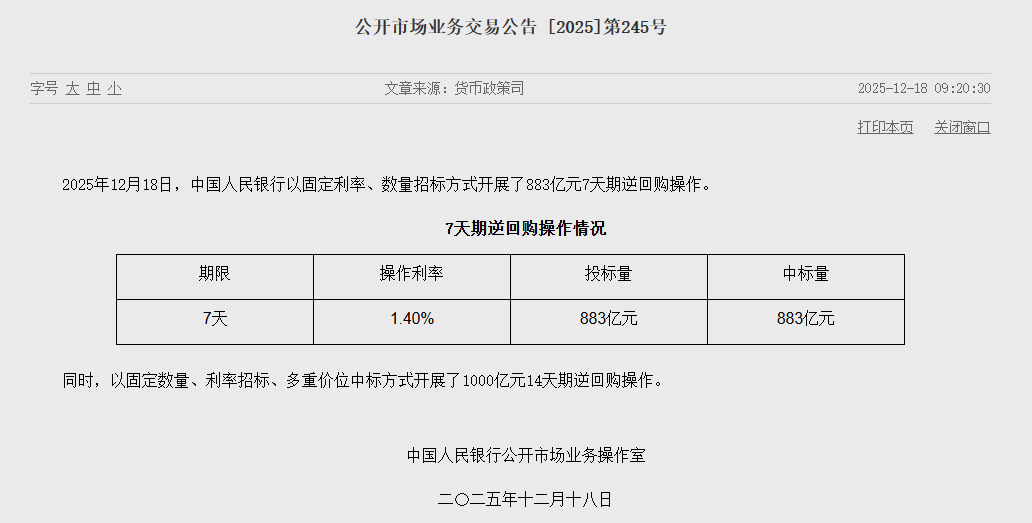 12月30日,央行当日开展3125亿元7天逆回购操作,操作利率为1.40%,与此前持平。因当日有593亿元7天期逆回购到期,当日实现净投放2532亿元。 12月29日,央行当日开展4823亿元7天逆回购操作,操作利率为1.40%,与此前持平。因当日有673亿元7天期逆回购到期,当日实现净投放4150亿元。 12月26日,央行开展930亿元7天逆回购操作,操作利率为1.40%,因当日有 562 亿元7天期逆回购到期,当日实现净投放368亿元。 公开市场方面,央行公告称,12月25日以固定利率、数量招标方式开展了1771亿元7天期逆回购操作,操作利率1.40%,投标量1771亿元,中标量1771亿元。数据显示,当日883亿元逆回购到期,据此计算,单日净投放888亿元。此外,今日央行开展4000亿元为1年期MLF操作,当日还有3000亿元MLF到期;12月央行通过MLF净投放1000亿元,为连续10个月加量操作MLF。(财联社) 12月24日,央行开展260亿元7天逆回购操作,操作利率为1.40%,与此前持平。因当日有468亿元7天期逆回购到期,当日实现净回笼208亿元。 12月23日,央行公开市场开展593亿元7天期逆回购操作,操作利率1.40%,因当日有1353亿元逆回购到期,实现净回笼760亿元。 12月22日,央行开展673亿元7天期逆回购操作,操作利率为1.40%,与此前持平。因当日有1309亿元7天期逆回购到期,当日实现净回笼636亿元。 12月19日,央行19日开展562亿元7天逆回购操作,操作利率为1.40%,与此前持平。同时,以固定数量、利率招标、多重价位中标方式开展了1000亿元14天期逆回购操作。因19日有1205亿元7天期逆回购到期,当日实现净投放357亿元。 12月18日,央行、开展883亿元7天逆回购操作,操作利率为1.40%,与此前持平。同时,央行以固定数量、利率招标、多重价位中标方式开展了1000亿元14天期逆回购操作。因18日有1186亿元7天期逆回购到期,当日实现净投放697亿元。
