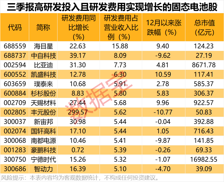 容百科技三季报显示,前沿材料方面,高镍及超高镍全固态正极材料已实现十吨级出货,富锂锰基材料得到客户吨级以上订单,硫化物电解质产品性能领先,目前正在推进中试线建设,部分量产设备完成带料验证,预计将于2026年初竣工,2026年上半年投产。 多氟多在投资者问答平台上表示,公司已布局聚合物/凝胶固态电池体系,开发出适用于固态电池的新型含氟高分子聚合物电解质,依托公司现有电池产线,已经具备生产装车能力。 部分固态电池概念股持续重视研发投入,统计显示,三季报研发费用同比实现增长的固态电池概念股中,14股研发费用占营业收入比例超过5%,约占总数的四分之一。其中,海目星、中自科技、比亚迪研发费用占营业收入比例居前,分别为15.88%、8.09%、7.73%。