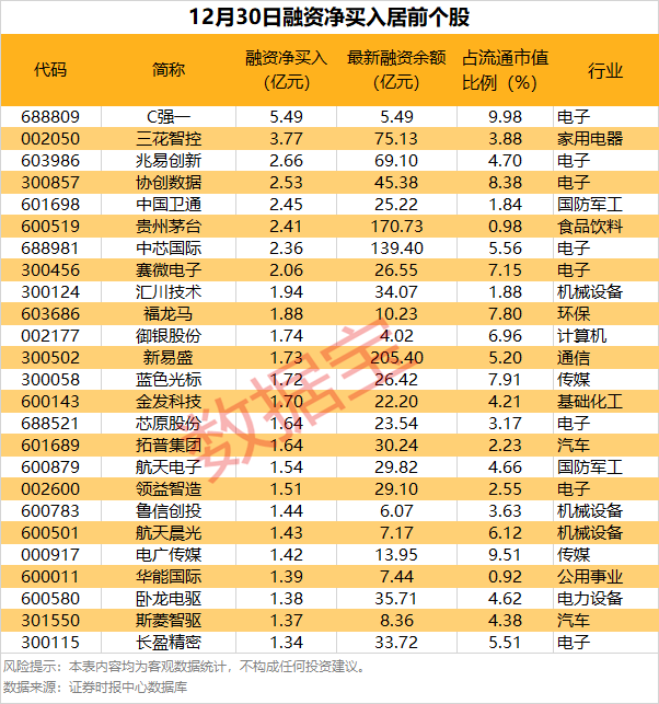 N新广益开盘价65元,上涨超250%。公司是一家专注于高性能特种功能材料研发、生产及销售的高新技术企业,主要产品有抗溢胶特种膜、强耐受性特种膜等特种功能材料。 37股杠杆资金净买入超1亿元 截至12月30日,市场融资余额合计2.54万亿元,较前一交易日增加36.82亿元。 具体到个股,12月30日获融资净买入千万元以上的有508只,其中37只融资净买入额超亿元。C强一融资净买入额居首,当日净买入5.49亿元,其次是三花智控、兆易创新,融资净买入金额分别为3.77亿元、2.66亿元,融资净买入金额居前的还有协创数据、中国卫通、贵州茅台等。 分行业统计,获融资客净买入超亿元个股中,电子、机械设备、国防军工等行业最为集中,分别有11只、5只、3只个股上榜。
