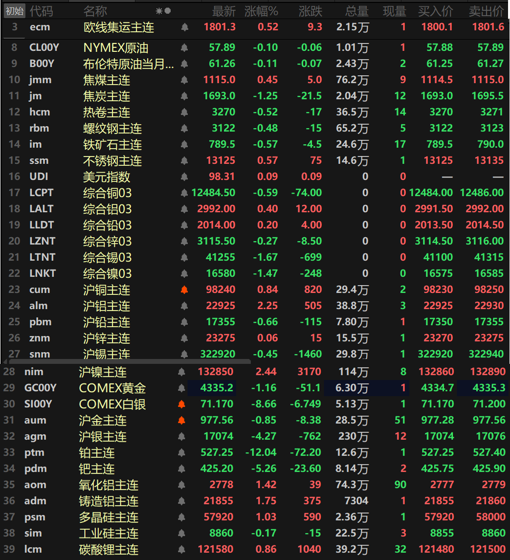 SMM 12月31日讯: 金属市场: 截至日间收盘,内盘基本金属普涨,仅沪铅和沪锡一同下跌,沪铅跌0.66%,沪锡跌0.45%。沪铝、沪镍一同涨逾2%,沪镍涨2.44%,盘中最高冲至135570元/吨,续刷2025年3月以来的新高;沪铝涨2.25%,盘中最高冲至23030元/吨,刷新2022年3月以来的新高。沪铜涨0.84%,沪锌小幅上涨0.06%。氧化铝主连涨1.42%,铸造铝主连涨1.75%。 此外,碳酸锂主连涨0.86%,工业硅主连跌0.17%,多晶硅主连涨1.03%。欧线集运主连涨0.52%报1801.3。 黑色系方面普跌,仅不锈钢上涨0.57%,其余金属跌幅均在1%以内。双焦方面,焦炭跌1.25%,焦煤涨0.45%。 外盘基本金属普跌,截至15:04分,外盘基本金属仅伦铝和伦铅一同上涨,伦铝涨0.4%,伦铅涨0.2%。伦锡、伦镍一同跌逾1%,伦锡跌1.67%,伦镍跌1.47%。其余金属跌幅均在1%以内。 贵金属方面,截至15:04分,COMEX黄金跌1.16%,COMEX白银大跌8.66%;沪金跌0.85%,沪银跌4.27%。 此外,铂主连暴跌12.04%报527.25元/克,钯主连跌5.26%报425.2元/克。 截至今日15:04分行情