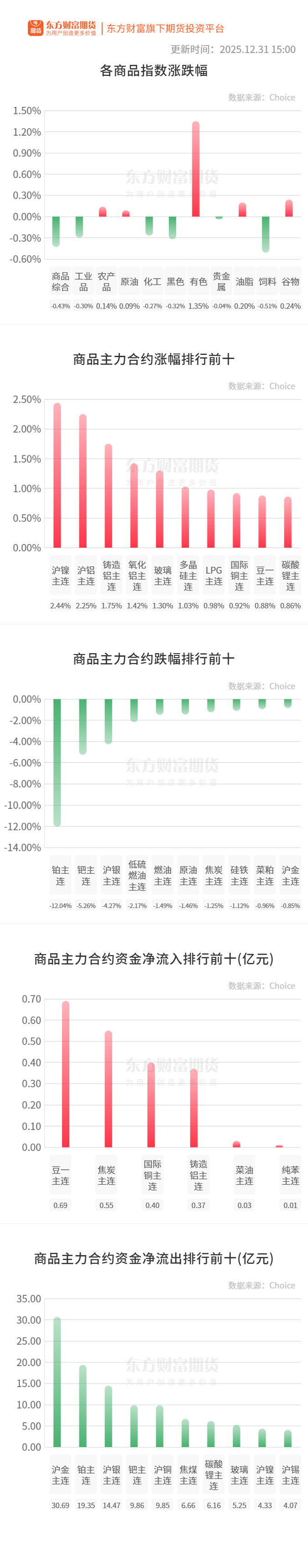 行情纵览![]() 宏观产经商务部:商务部等5部门办公厅(室)印发关于做好2026年家电以旧换新、数码和智能产品购新补贴工作的通知。2026年1月1日起,按照全国统一的品类和标准,对个人消费者购买1级能效或水效标准的冰箱、洗衣机、电视、空调、热水器、电脑6类家电产品,以及单件销售价格不超过6000元的手机、平板、智能手表(手环)、智能眼镜4类数码和智能产品给予补贴。补贴标准为上述产品扣除各环节优惠后最终销售价格的15%,每人每类可补贴1件,其中,家电产品每件补贴不超过1500元,数码和智能产品每件补贴不超过500元。 国家统计局:12月份,制造业采购经理指数(PMI)为50.1%,比上月上升0.9个百分点,升至扩张区间。 21世纪经济报道:欧盟“碳关税”真的要落地了!2026年1月1日起,欧盟碳边境调节机制(CBAM)正式进入“收费期”,钢铁、水泥、铝、化肥、电力和氢6类产品先被纳入。但这只是开始,按欧盟委员会方案,到2028年,CBAM覆盖范围拟将扩大至洗衣机、汽车零部件、机械设备等在内约180种钢铁和铝密集型下游产品。 品种资讯黑色系期货 焦煤:近日,证监会同意大连商品交易所焦煤期权注册。证监会将督促大连商品交易所做好各项准备工作,确保焦煤期权的平稳推出和稳健运行。(证监会) 钢材:印度财政部12月30日发布公告称,该国继续对部分进口钢铁产品征收为期三年的关税,期间税率介于11%至12%之间。按照这项被称为保障措施关税的征收方案,第一年税率为12%,第二年降至11.5%,第三年为11%。今年4月起,印度政府已实施为期200天的临时性12%关税。(界面新闻) 截止12月31日当周,据找钢网数据显示,全国重点钢材品种产量、库存如下:全国建材数据产量450.28万吨,较上周增加22.89万吨;厂库379.05万吨,较上周增加3.88万吨;社库344.65万吨,较上周减少21.07万吨;总库存723.70万吨,较上周减少17.19万吨;表需467.47万吨,较上周增加16.67万吨。(找钢网) 不锈钢:2025年12月31日,全国主流市场不锈钢89仓库口径社会总库存97.74万吨,周环比下降2.76%。其中冷轧不锈钢库存总量57.42万吨,周环比下降3.32%,热轧不锈钢库存总量40.32万吨,周环比下降1.96%。(Mysteel) 农产品期货 棕榈油:据马来西亚独立检验机构AmSpec,马来西亚12月1-31日棕榈油出口量为1197434吨,较上月同期出口的1263298吨减少5.2%。(新华财经) 生猪:财联社记者多方采访获悉,2026年上半年供应仍旧充裕,但在前期产能去化背景下,猪价或有望在二季度末至三季度迎来回暖。有企业人士表示,产能调控明年可能还会继续深入推进,“养殖端也不会像原来那样自如的去做增量,这可能也是为什么大家预测明年下半年开始猪价会逐步回暖的逻辑。”(财联社) 有色/贵金属期货 氧化铝:据12月31日数据,国内氧化铝总库存环比累库13.6万吨,短期内,虽然氧化铝运行产能表现出下滑趋势,电解铝产量增加,即氧化铝需求增加,但氧化铝基本面尚未扭转,仅表现为过剩幅度收缩,氧化铝库存压力仍存,短期内氧化铝库存预计延续累库趋势。(SMM) 沪铝:据SMM数据,2025年12月海外电解铝总产量同比增长2.2%,月度平均开工率为87.7%,环比下降1.1个百分点,同比降低0.8个百分点,主因印尼新建电解铝项目投产,但运行产能处于爬坡阶段,稀释海外电解铝开工率。 多晶硅:截至12月31日,本周多晶硅(N型致密料)市场均价50元/千克,生产成本约40.95元/千克,净利为9.05元/千克。价格方面,本周多晶硅N型致密料均价环比持平。成本方面,成本环比持平。本周多晶硅环节净利润环比持平。(Mysteel) 沪镍:印度尼西亚镍冶炼厂协会预计2026年国内镍冶炼行业的镍矿需求量约为3.4亿-3.5亿吨。(财联社) 12月31日讯,供应端来看,盘面价格居高不下,看涨情绪仍未消退,上游企业报价持续上涨。需求端来看,随着价格持续上涨,下游企业询盘增加,叠加部分下游刚需补库,市场成交价上涨。总体而言,市场上涨趋势明显,高镍生铁价格重心上抬。(SMM) 能化期货 甲醇:截至2025年12月31日,中国甲醇港口库存总量在147.74万吨,较上一期数据增加6.49万吨。其中,华东地区累库,库存增加3.98万吨;华南地区累库,库存增加2.51万吨。本周甲醇港口库存继续积累,周期内显性外轮计入32.49万吨,非显性外轮计入10.9万吨。(隆众资讯) 尿素:山东地区尿素行情个别波动,小颗粒主流出厂成交1680-1720元/吨,大颗粒出厂参考1870元/吨。临沂市场一手贸易商出货参考价格1710-1720元/吨附近,菏泽市场参考价格1690-1700元/吨附近。省内企业生产基本正常。昨日部分企业新单成交好转,价格上调10-20元/吨。(隆众资讯) 晚间关注21:30 美国:当周首次申请失业金人数 23:30 美国:当周EIA原油库存 (文章来源:东方财富研究中心) |