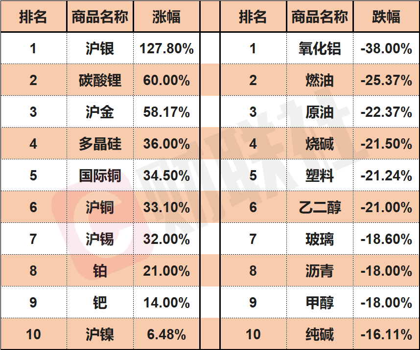 2025年国内期货市场年度收官,贵金属、有色表现惊艳,地缘政治冲突不断、美联储降息、全球央行增持等因素令沪金、沪银分别以58.17%、127.8%年涨幅领涨市场,反内卷与减产消息刺激,碳酸锂触底回升,今年以来涨近60%,多晶硅涨36%,国际铜、沪铜分别涨34.5%、33.1%,沪锡涨32%,除碳酸锂外均创出上市以来年度收盘新高,焦煤、焦炭触底收出下影线,分别收跌4%、6.6%。此外,年底上市新品铂、钯期货上演过山车行情,其中铂12月份录得5个涨停、2个跌停,最终分别收涨21%、14%。跌幅方面,受国际原油下跌带动,内盘化工品普跌,氧化铝以42%幅度领跌,上期所原油跌22.37%,乙二醇跌超21%,烧碱跌21.5%,玻璃跌18.6%,纯碱跌16.11%,沥青跌18%,塑料跌21.24%,甲醇跌超18%。 ![]() (文章来源:财联社) |