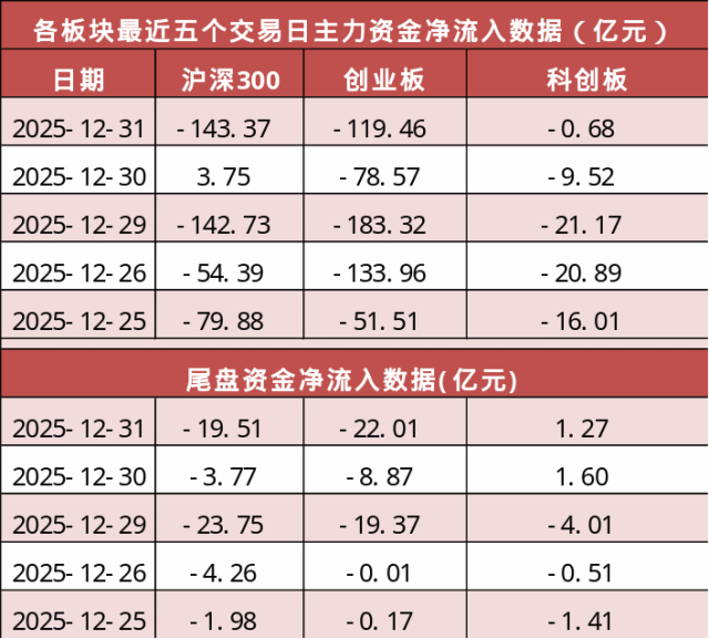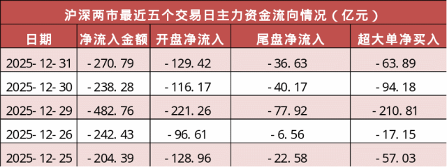 盘后数据出炉。 12月31日,A股市场主要股指多数下跌,截至收盘,上证指数报3968.84点,上涨0.09%;深证成指报13525.02点,下跌0.58%;创业板指报3203.17点,下跌1.23%。两市合计成交20451.42亿元,较上一交易日减少971.83亿元。 1.两市主力资金净流出超270亿元 今日沪深两市主力资金开盘净流出129.42亿元,尾盘净流出36.63亿元,两市全天主力资金净流出270.79亿元。