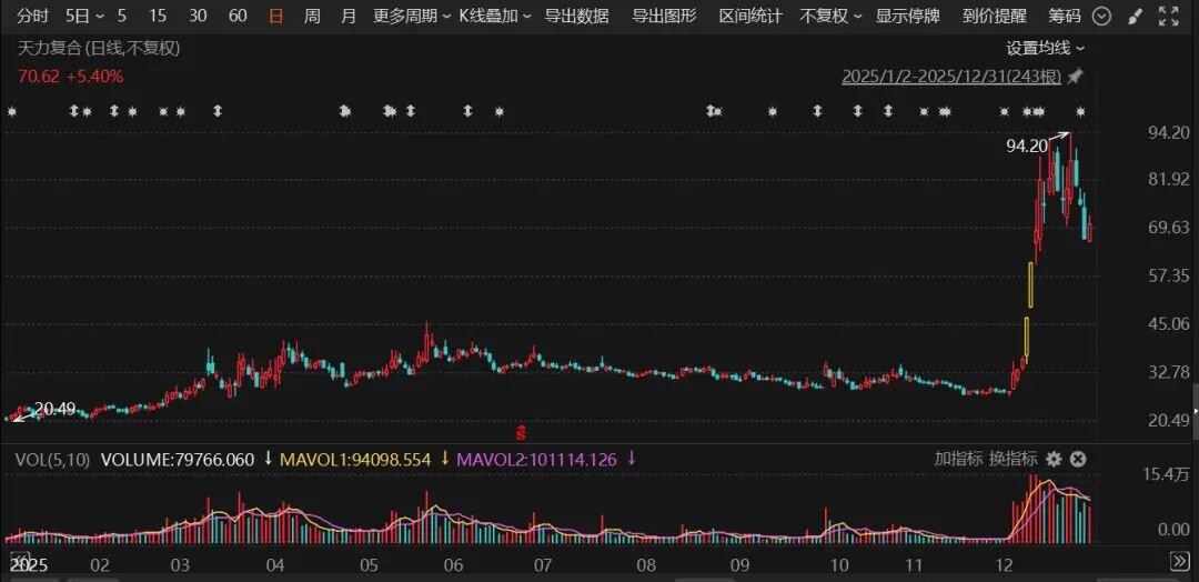 其中,天力复合全年累计涨幅达242.13%。消息面上,近期公司受到核聚变和商业航天两重概念集中催化,引发资金“抢筹”,其股价于12月25日创下历史新高94.20元。2025年商业航天成为资本市场核心热点赛道,政策层面被纳入战略性新兴产业集群,作为西部材料的控股子公司,其具备聚变装置第一壁相关材料的批量供货能力。今年6月,其以联合体成员中标中国科学院合肥物质科学研究院等离子体物理研究所装置内部部件改造第一壁热沉项目,现在相关产品已完成部分交付。 天铭科技则在2025年最后两个交易日连续涨停,全年累计涨152.89%。日前天铭科技也公告迎接一批机构调研,公司与杭州中致高智能科技合作研发的机器人相关产品进展及量产时间,成为机构问询的重点。天铭科技称,双方合作研发的产品为机器人驱动关节,目前定型样机试制已初步完成,预计2026年完成批量试制。