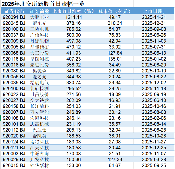 从总市值来看,总共有9家企业市值超过100亿元,其中贝特瑞、锦波生物市值分别为364.81亿元、268.91亿元。 新股市场热度飙升 2025年北交所新股市场迎来“黄金年份”,赚钱效应凸显,打新热度持续升温。 今年北交所IPO节奏加快,全年新上市企业达26家,首日平均涨幅达356%,申购资金规模显著提升。其中大鹏工业、三协电机等上市首日涨幅在500%以上;从网上冻结资金情况来看,南特科技、锦华新材、蘅东光居于前三位,冻结资金均超过8000亿元。 大鹏工业是今年唯一一只首日收盘涨幅仍在10倍以上的北交所新股,其在上市首日大涨1211.11%。公司主要从事精密工业清洗产品的研发、设计、生产和销售,主要产品包括工业清洗设备、工业清洗剂。 在新股供给端,2025年北交所过会审核节奏显著提速,优质资产供给持续增加。从过会企业质地来看,以“专精特新”企业为主,覆盖新能源、半导体、新材料等硬科技领域,且发行估值优势显著。华源证券认为,北交所正处于高质量扩容期,可以重点关注具备全市场稀缺性且壁垒较高的企业和募投项目拓展公司“第二增长”曲线的公司。 估值性价比凸显 中国小康建设研究会经济发展工作委员会专家余伟认为,2025年北交所二级市场的交易活跃度依然保持在较高水平,无论是日成交金额还是换手率都很亮眼。而北交所今年新上市的公司质地普遍很好,无论是行业属性、业绩还是业务规模都有明显提升,这说明北交所对优质创新型中小企业的吸引力显著增强。 展望2026年,余伟认为,新的一年北交所将会有更多优质企业上市,北交所二级市场的交易活跃度相比今年会有明显提升,“同时,我希望北交所能于2026年正式推出北交所ETF,让更多种类的资金能参与到北交所投资,共同促进北交所做大做强”。 资深新三板评论人、北京南山投资创始人周运南认为,如果市值打新和北证50ETF两项改革政策能在新年落地,则看好“2026年北证50指数能顺利站上2000点,日成交金额能成功突破500亿元,北交所总市值突破1.2万亿元,北交所诞生多只市值过500亿的个股,北交所百花齐放春满园”。 周运南表示,新的一年,其重点看好四个方向:首先是并购重组,2026年会是北交所支持并购重组的大年;二是人工智能+,包括半导体、机器人、无人机、Al、大数据、无人驾驶等相关;三是商业航天方向;四是脑机工程方向。 曹森元则建议采取“稳健布局,双线并进”的策略:其一,关注北交所高分红个股和双指数重合个股,这些标的可能随被动增量资金入场而受益。其二,布局科技成长风格,特别是泛AI应用、商业航天、智能制造、人形机器人、数字经济等政策支持方向。同时,打新策略仍具价值。2025年北交所新股赚钱效应明显,打新参与热度持续提升。随着审核提速,2026年新股供应有望增加,为打新策略提供更多机会。 校对:王蔚 |