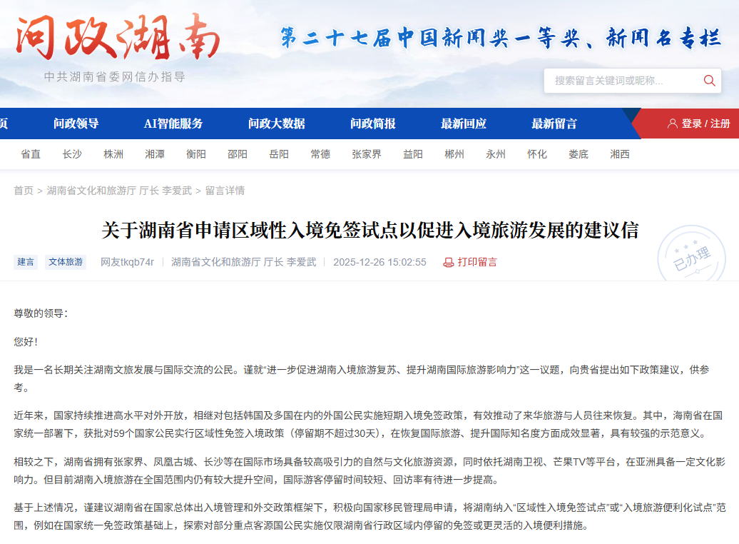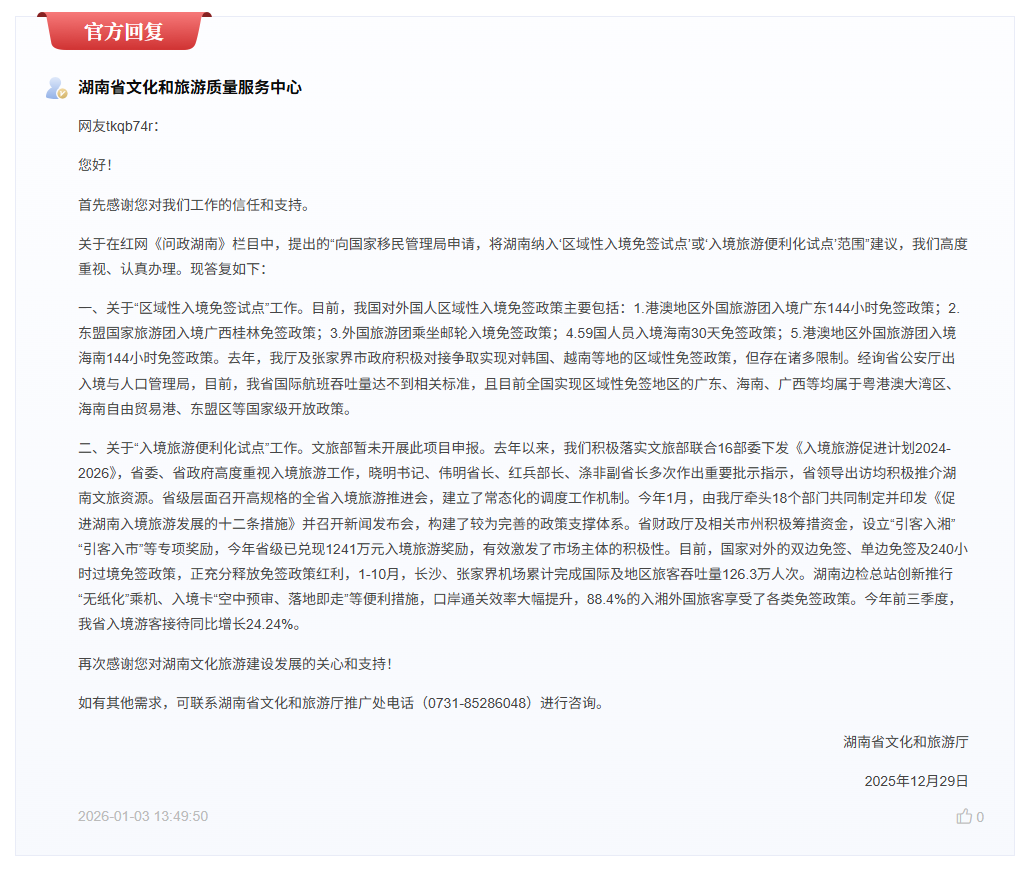 编者按:民声有呼,政必有应。红网时刻新闻客户端全新推出“时刻回ing”专栏,以“回应”践行为民初心,以“回音”彰显政务担当。专栏每日精选红网王牌栏目:《问政湖南》的铿锵回响、《百姓呼声》的热切应答、《消费维权》的责任强音,将三湘大地的“急难愁盼”化作政务服务的“行动清单”。 网友在《问政湖南》栏目上的发帖内容与官方回应。(点击图片查看详情) 红网时刻新闻1月4日讯(记者 陈星晓)近日,有网友在红网《问政湖南》栏目建言,建议湖南省积极向国家移民管理局申请,将湖南纳入“区域性入境免签试点”或“入境旅游便利化试点”范围,以进一步提升湖南入境旅游的吸引力和竞争力。 该网友在建议信中表示,湖南拥有张家界、凤凰古城、长沙等具有国际知名度的旅游资源,以及湖南卫视等文化传播平台,具备发展入境旅游的良好基础。可以借鉴海南省对59国公民实施区域性入境免签的成功经验,网友认为,此类政策类试点政策有望在以下方面发挥积极作用: 一是显著提升湖南对日韩及东南亚等重点国际客源市场的吸引力; 二是延长境外游客在湘停留时间,带动住宿、交通、演艺、文旅消费等相关产业发展; 三是进一步提升湖南作为国际旅游目的地的辨识度和综合竞争力; 四是为国家探索中部地区高水平对外开放和入境管理政策提供可复制经验。 网友同时表明,理解并支持出入境政策由国家统一制定,但地方应在服从中央部署的前提下积极争取试点机会。 对此,湖南省文化和旅游厅作出详细答复: 关于“区域性入境免签试点”,答复指出,目前我国对外国人区域性入境免签政策主要包括:1.港澳地区外国旅游团入境广东144小时免签政策;2.东盟国家旅游团入境广西桂林免签政策;3.外国旅游团乘坐邮轮入境免签政策;4.59国人员入境海南30天免签政策;5.港澳地区外国旅游团入境海南144小时免签政策。去年,湖南省文化和旅游厅及张家界市政府积极对接争取实现对韩国、越南等地的区域性免签政策,但存在诸多限制。经询省公安厅出入境与人口管理局,目前,湖南省国际航班吞吐量达不到相关标准,且目前全国实现区域性免签地区的广东、海南、广西等均属于粤港澳大湾区、海南自由贸易港、东盟区等国家级开放政策。 关于“入境旅游便利化试点”,答复说明,国家文旅部暂未启动此类项目的申报工作。但近年来,湖南省已将促进入境旅游作为重点工作。 答复详细介绍,湖南省委、省政府高度重视入境旅游发展,已建立常态化调度工作机制。今年1月,由省文旅厅牵头18个部门共同制定并印发《促进湖南入境旅游发展的十二条措施》,构建了较为完善的政策支撑体系。省财政厅及相关市州积极筹措资金,设立“引客入湘”“引客入市”等专项奖励,今年省级已兑现1241万元入境旅游奖励,有效激发了市场主体的积极性。 答复引用数据称,目前国家对外的双边免签、单边免签及240小时过境免签政策,正充分释放免签政策红利。1-10月,长沙、张家界机场累计完成国际及地区旅客吞吐量126.3万人次。湖南边检总站创新推行“无纸化”乘机、入境卡“空中预审、落地即走”等便利措施,口岸通关效率大幅提升,88.4%的入湘外国旅客享受了各类免签政策。今年前三季度,湖南省入境游客接待同比增长24.24%。