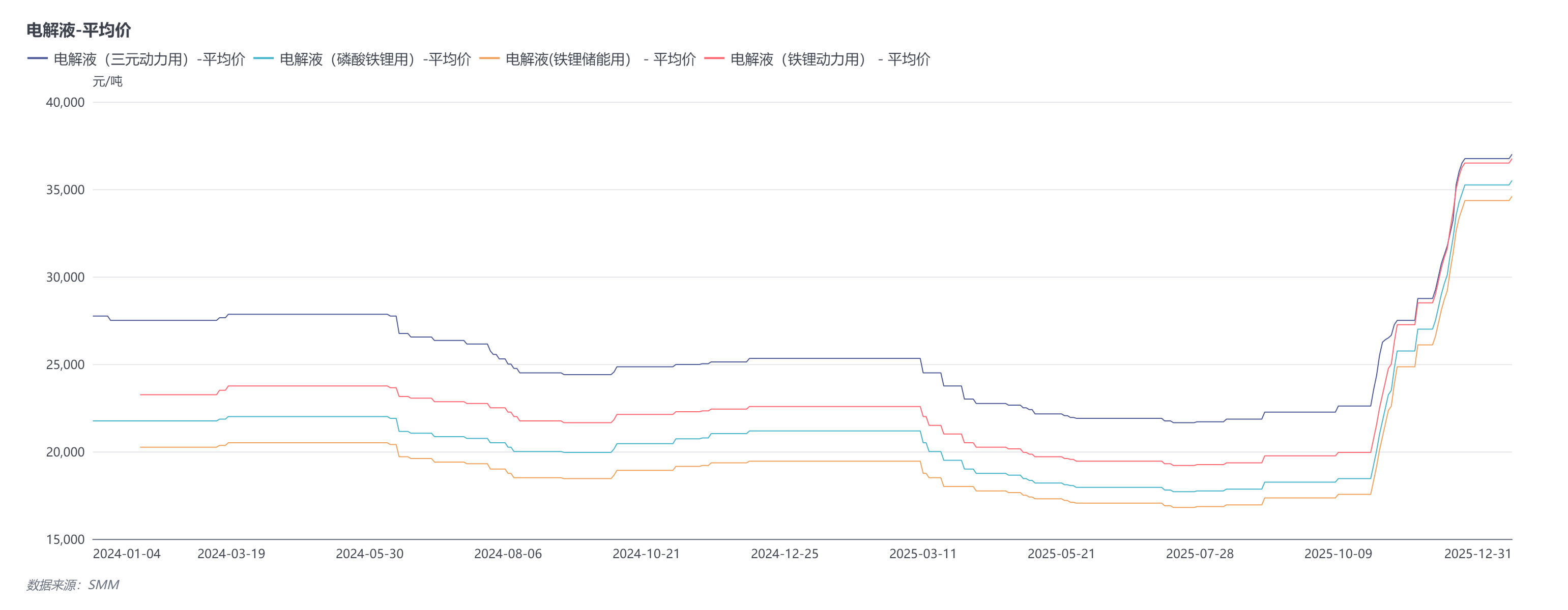 提及公司业绩变动的原因,天赐材料表示,主因新能源车市场需求持续增长以及储能市场需求快速增长,公司锂离子电池材料销量同比大幅增长。同时因公司核心原材料的产能爬坡与生产环节的成本管控,整体盈利能力提升。 在11月20日接受投资者活动调研时,天赐材料曾表示,公司现有电解液产能约85万吨,六氟磷酸锂产能约 11 万吨,随着下游需求特别是储能市场的快速增长,目前公司电解液、六氟磷酸锂、LiFSI 等核心产品及材料已基本达到满产状态。 此外,天赐材料还表示,从四季度销量预测看,2025年公司电解液全年销量预计72万吨,其中上半年约31万吨,下半年约41万吨,已超过年初公司制定的70万吨全年目标。 回顾2025年的电解液市场,上半年国内电解液市场整体表现平淡,因成本的逐步走低和下游需求表现不佳,整体电解液价格呈现震荡下行态势;但自进入2025年三季度以来,随着“金九银十”下游消费旺季的到来,来自储能和动力电池市场的需求持续攀升,带动市场对电解液、六氟磷酸锂等材料的需求也快速增长。彼时,电解液核心原材料六氟磷酸锂、VC、FEC等因前期行业长期亏损,生产积极性较弱,并有一定程度去库存,使得产能释放节奏滞后于需求增长,市场呈现供应偏紧格局,价格短期内大幅上涨,原材料的快速上行带来的成本上涨逐步传导至电解液价格层面,电解液价格顺势止跌回升。 进入2025年四季度,虽然电极液的核心原材料六氟磷酸锂、VC、FEC 等因前期需求拉动形成的供应偏紧格局虽有所缓解,但价格依旧维持高位运行,为电解液价格提供了坚实成本支撑,推动电解液价格有所上涨。但需要注意的是,由于下游电芯企业对原料价格大幅上涨的传导接受度有限,部分订单成本难以完全转嫁,所以目前对于缺乏自有原料产能,依赖外采高价原料的电解液企业而言,面临显著的成本压力。 不过即便如此,在2025年,电解液价格依旧整体呈现震荡上行的态势,截至2025年12月31日,铁锂动力用电解液现货报价涨至31500~42000元/吨,均价报36750元/吨,较2024年年底的22575元/吨上涨14175元/吨,涨幅达62.79%;铁锂储能用电解液则在2025年12月31日涨至29000~40200元/吨,均价报34600元/吨,较2024年年底的19450元/吨上涨15150元/吨,涨幅达77.89%;三元动力用电解液在2025年12月31日涨至32000~42000元/吨,均价报37000元/吨,较2024年年底的25325元/吨上涨11675元/吨,涨幅达46.1%。
