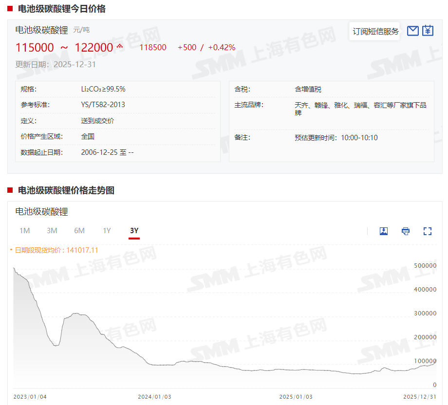 对于公司业绩变动的原因,盐湖股份表示,报告期内,公司主营业务保持稳健,氯化钾产量约 490 万吨,销量约381.43 万吨;碳酸锂产量约 4.65 万吨,销量约 4.56 万吨;两钾(氢氧化钾、碳酸钾)合计产量约 38.22 万吨,销量约 38.89 万吨。报告期内,氯化钾产品价格较上年同期有所上升,碳酸锂产品价格虽波动较大,但下半年逐步回暖,整体带动公司业绩同比实现增长。 其中碳酸锂价格方面,以SMM现货报价为例,电池级碳酸锂在2025年整体呈现先跌后涨的态势,其一度在6月24日跌至年内低点59900元/吨,随后,在国内“反内卷”政策以及江西锂矿供应端的扰动和下游动力与储能市场的超预期带动下,碳酸锂市场进入去库阶段,价格开始持续回暖。截至2025年12月31日,电池级碳酸锂现货报价涨至11.5~12.2万元/吨,均价报11.85万元/吨,较2024年年底的7.505万元/吨,上涨4.345万元/吨,涨幅达57.89%。