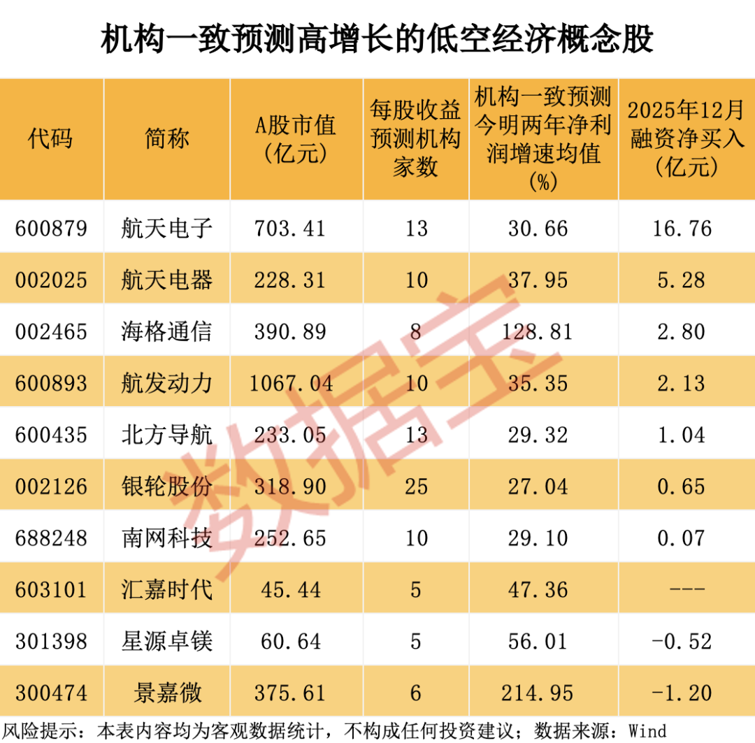 据数据宝统计,从未来增长潜力来看,根据5家及以上机构一致预测,2026年、2027年净利润增速均有望超20%的低空经济概念股有10只。 这10股当中,2025年12月融资净买入均逾1亿元的有5股,分别是航天电子、航天电器、海格通信、航发动力、北方导航。 航天电子2025年12月融资净买入16.76亿元,居首。东方证券研报认为,随着未来可回收技术突破、运力瓶颈解除,火箭发射速度将快速提升,公司低轨卫星业务有望成为新的增长亮点。