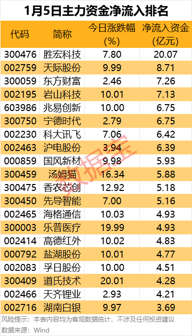 有色金属、基础化工、医药生物、电子行业主力资金净流入均超12亿元。 A股喜迎2026年开门红,重新站上4000点大关。行业板块呈现普涨态势,保险、医疗器械、医疗服务、船舶制造等板块涨幅居前。 据证券时报·数据宝统计,今日(1月5日)沪深两市主力资金净流出62.98亿元。从行业来看,申万一级行业中有12个行业主力资金净流入,其中有色金属、基础化工、医药生物、电子行业净流入均超12亿元;银行、石油石化行业净流入均超5亿元;传媒、纺织服饰、食品饮料行业净流入均超1亿元。 19个主力资金净流出的行业中,汽车、机械设备、通信行业净流出金额居前,均超20亿元;轻工制造、国防军工行业净流出金额均超10亿元。 8股净流入金额均超6亿元 从个股来看,57股主力资金净流入超3亿元,其中8股净流入金额均超6亿元。 胜宏科技主力资金净流入20.07亿元,远超其他个股。午后PCB概念股异动拉升,消息面上,国金证券研报称,2026年英伟达Rubin部分PCB开始采用M9材料,正在推进的正交背板对M9材料需求较大,谷歌TPU产品也有望采用M9材料,其他ASIC厂商也有望采用M9,未来三年M9材料需求爆发式增长。 天际股份主力资金净流入8.71亿元。近日,公司在投资者互动平台表示,六氟磷酸锂目前为满产满销状态,现产能为3.7万吨/年,另有募投项目二期年产1.5万吨六氟磷酸锂项目预计于2026年四季度完工。