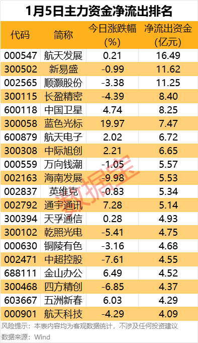 据数据宝统计,82股主力资金净流出超4亿元,其中航天发展、新易盛、顺灏股份净流出金额均超11亿元;长盈精密、中国卫星、蓝色光标、航天电子、中际旭创等个股净流出金额也居前。
