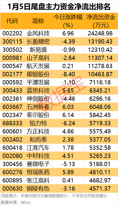 据数据宝统计,金风科技、长盈精密、新易盛、山子高科、航天发展、御银股份等个股尾盘主力资金流出居前。