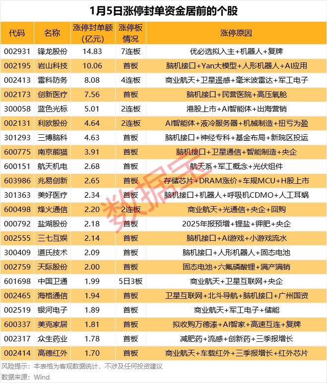 截至今日(1月5日)收盘,上证指数报收4023.42点,上涨1.38%;深证成指收于13828.63点,上涨2.24%;创业板指上涨2.85%;科创50指数上涨4.41%。 不含未开板新股,今日可交易A股中,上涨个股超4100只,占比超76%,下跌个股1100余只。其中,收盘封死涨停的有126只,42股封板未遂,整体封板率为75%。 据证券时报•数据宝统计,封死涨停个股中,以所属行业来看,涨停个股居前的行业有医药生物、电子、国防军工,涨停个股有22只、11只、11只。 封死涨停股中,*ST阳光、*ST万方等19股为ST股。从连续涨停天数来看,锋龙股份已连收7个涨停板,连续涨停板数量最多。 以封单金额计算,锋龙股份、岩山科技、雷科防务等涨停板封单资金较多,分别有14.83亿元、10.06亿元、8.08亿元。从封单力度(收盘封单金额占流通市值比例)来看,锋龙股份、创新医疗、光华股份等力度较大,分别为21.13%、7.68%、5.74%。