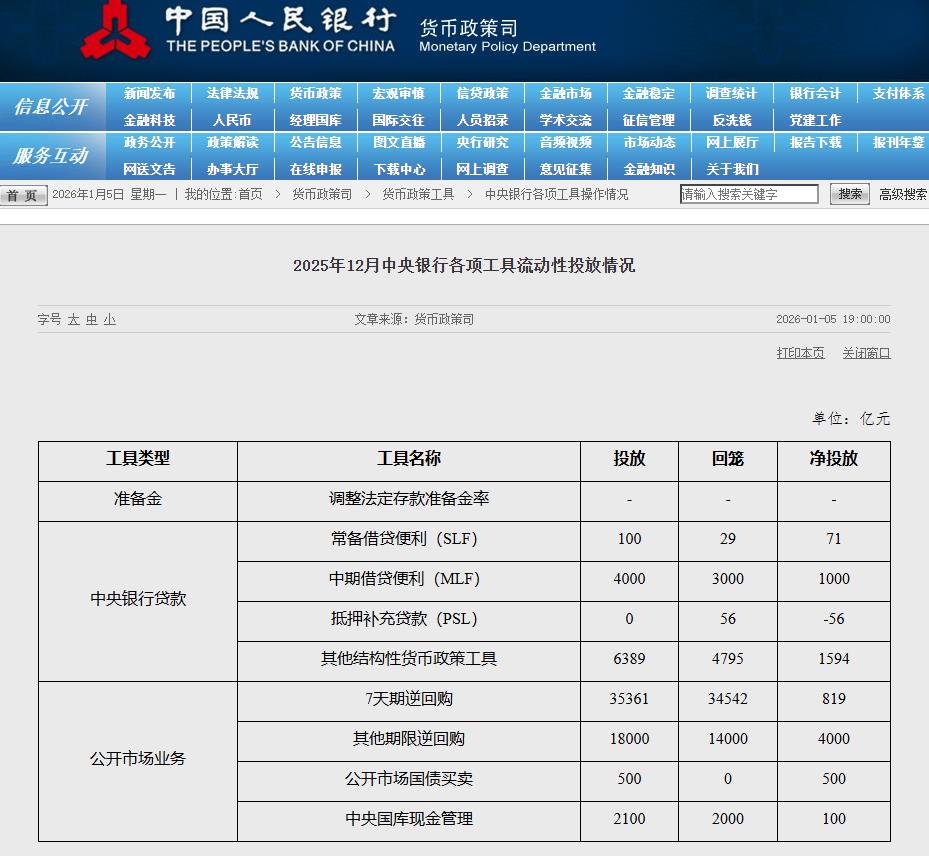 央行发布2025年12月中央银行各项工具流动性投放情况,其中12月公开市场国债买卖净投放500亿元,为连续第三月开展国债买卖操作。