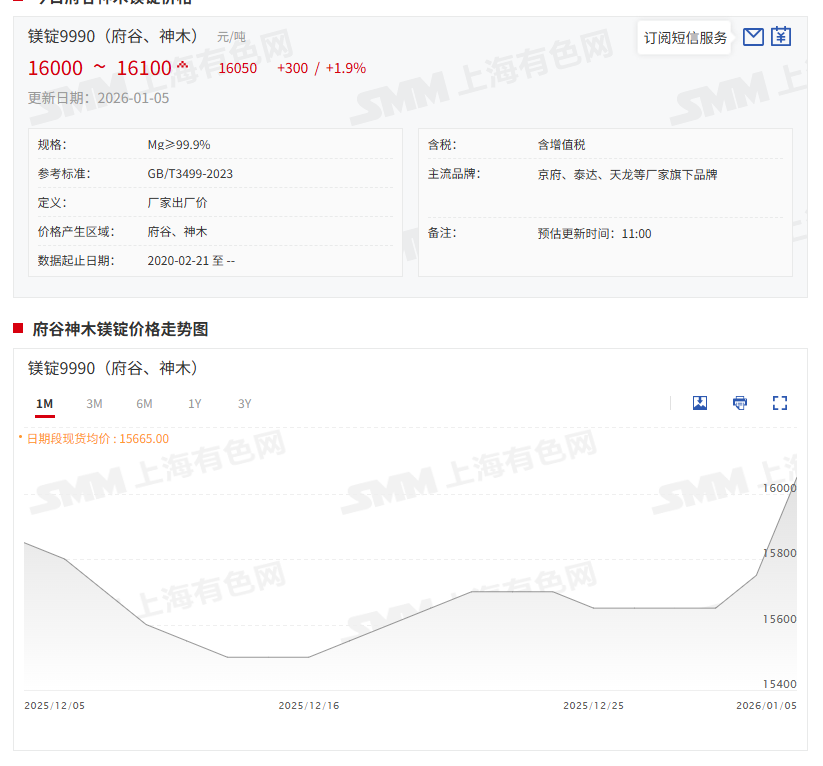 》点击查看SMM镁现货价格 》订购查看SMM金属现货历史价格走势 现货市场方面: 据SMM报价显示,1月5日,SMM镁锭9990(府谷、神木)报16000~16100元/吨,其均价为16050元/吨,较前一交易日上涨1.9%,镁锭价格顺利斩获节后 “开门红”。 回顾镁锭2025年的价格表现可以看出:2025年90镁锭市场价格呈现“M”形走势,价格重心显著下移。价格从年初16000元/吨下跌至3月7日价格年内最低点15050元/吨;紧接着价格低位反弹,5月13日达到年内高位17450元/吨;随着贸易商受畏高情绪驱使低价抛货,由此引发价格崩塌,价格弱势震荡至6月10日15950元/吨;随后下游逢低买入,冶炼厂持续去库助推镁价反弹,镁价再次拉高至17400元/吨;三季度末至四季度,镁厂集中复产使得供需格局再次逆转,供应压力急剧增加,12月2日第三次跌破16000元/吨,镁价低位盘整运行。整体来看,2025年全年价格波动幅度在2500元以内,整体波动幅度较上一年明显收窄。 此次节后镁锭价格的偏强运行,与当前市场供需结构及情绪面密切相关:头部厂家惜售情绪浓厚,中小型厂家现货有限,在消息面及外贸订单支撑下,市场报价纷纷上调。而随着镁厂报价保持坚挺,部分采购商积极入场进行刚需备货,推动市场成交活跃度显著提升。 镁合金