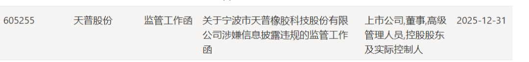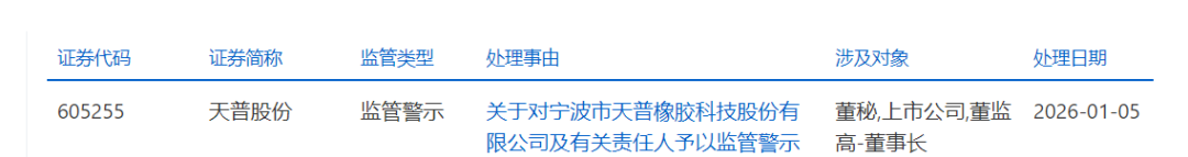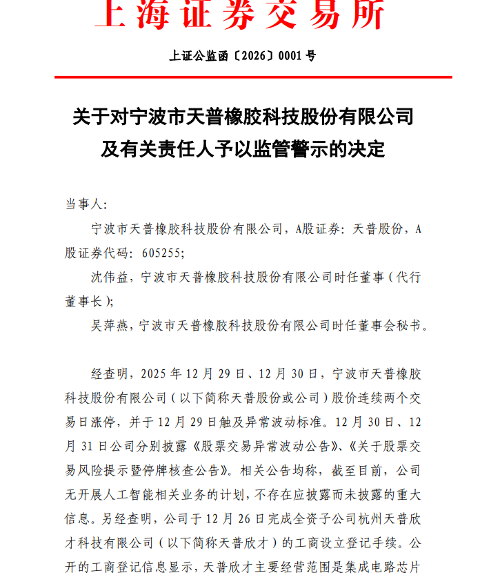沪市2026年001号监管警示决定书发出! 1月5日,上交所发布《关于对宁波市天普橡胶科技股份有限公司及有关责任人予以监管警示的决定》,这是2026年沪市首份监管警示决定书。 此前2025年12月31日,上交所已对天普股份发出监管工作函,处理事由为涉嫌信息披露违规。涉及对象除公司外,还有董事、高管以及控股股东及实际控制人。