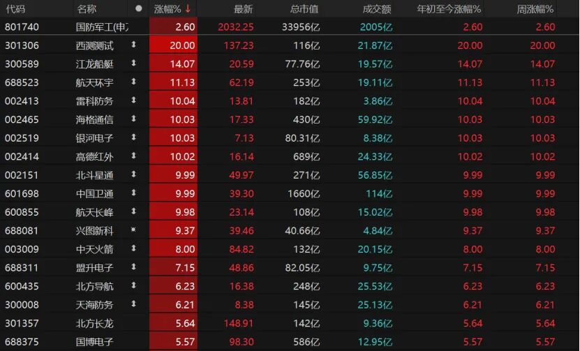 国防军工板块也表现不错,西测测试、雷科防务、海格通信、银河电子、高德红外等11只个股涨停。