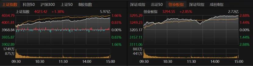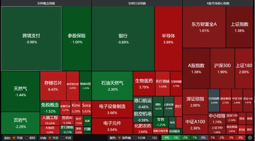 受访人士表示,国际流动性宽松、美元贬值、人民币升值及国内政策利好共振,今日A股放量大涨,资金从低股息权重切换至高景气成长,市场风险偏好显著提升。短期强势有望延续,可逢低关注脑机接口、半导体等新兴产业,同时警惕技术性回调、海外不确定性与行业分化风险。 沪指12连阳 A股新年开门红:沪指12连阳,收涨1.38%报4023.42点;创业板指涨2.85%报3294.55点,深证成指涨逾2%;科创50飙升4.4%,沪深300、上证50、北证50齐涨约2%。