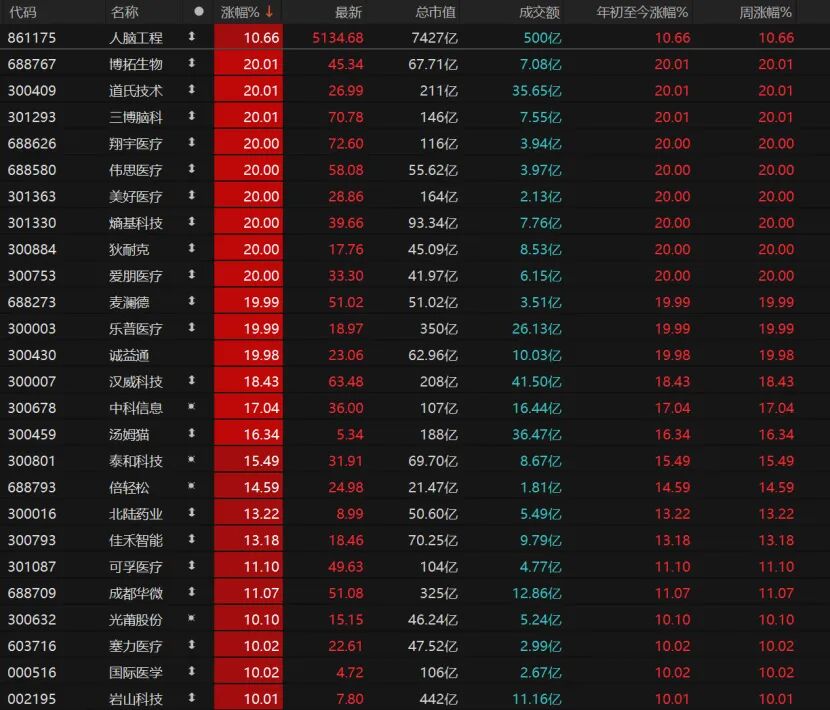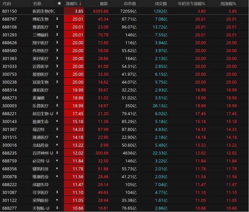 22只医药生物个股涨停,博拓生物、赛诺医疗、三博脑科、翔宇医疗、伟思医疗、美好医疗、迈普医学、爱朋医疗、冠昊生物、康拓医疗、麦澜德、乐普医疗12只个股更是“20cm”涨停。