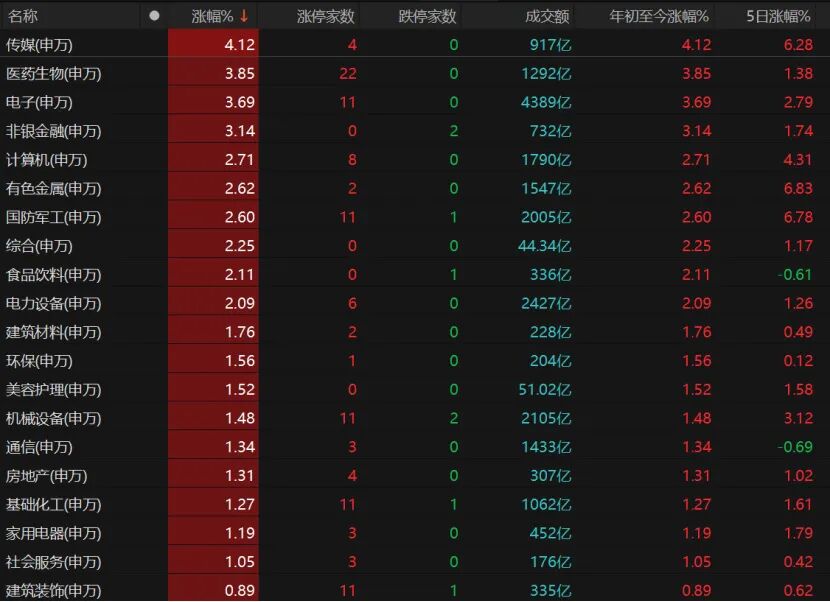 31个申万一级行业中26个飘红,石油石化、银行等板块微跌,传媒板块大涨,蓝色光标、天下秀、引力传媒、三七互娱等个股涨停;医药生物、电子、非银金融、计算机、有色金属、国防军工、综合、食品饮料、电力设备板块涨幅均超过2%。