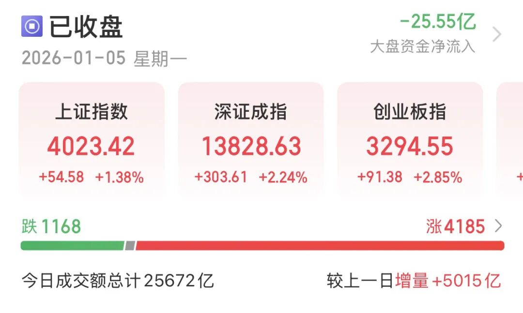 1月5日,A股以放量大涨拉开2026年序幕,日成交额增至2.57万亿元,赚钱效应良好,4185只个股收红,传媒、医药生物、电子、证券、大消费等均表现亮眼。
