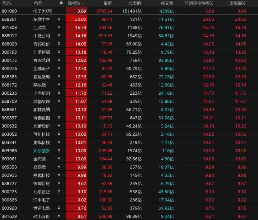 11只电子股涨停,恒烁股份、云汉芯城、普冉股份、东微半导“20cm”涨停。
