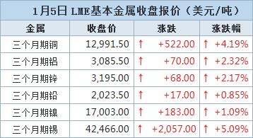 1月5日(周一),伦敦金属交易所(LME)期铜首次突破每吨13,000美元,因智利一铜矿发生罢工,加上市场预期将出现供应缺口及伦敦金属交易所认证仓库库存偏低,供应忧虑升温。 伦敦时间1月5日17:00(北京时间1月6日01:00),LME三个月期铜上涨522美元,或4.19%,收报每吨12,991.5美元。盘中一度触及13,045美元,刷新12月29日创下的12,960美元的纪录高位。